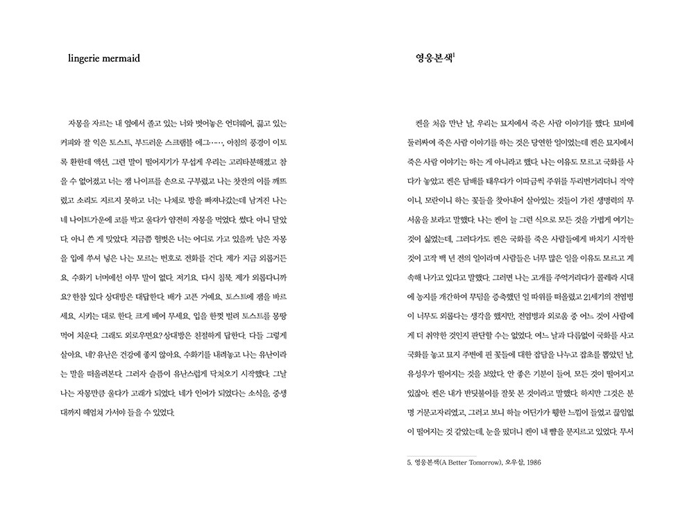 N씨 표류기 | RE: FW: 화성 이주 관련의 건 | 제목 없음(성의도 없음) | mirepoix | 무지몽매 | 자동 완성 | 레몬과 진저에일 | 보헤미안 | 5월의 눈 | 신자유주의 | 소금 자국 | 연리連理의 연리年利 | 분수 | lunch box | 토요일 | 시간의 흐름은 시점의 이동에서 | 사소해서 시시해 | lingerie mermaid | 영웅본색 | Undine | 밤은 짧아, 걸어 아가씨야 | 타인의 취향 | 신의 소녀들 | 霓虹甜心 | 그리고 저는 시네필이 아닙니다 | fortune cookie | 아무도 나를 초대하지 않은 파티에 초대되고 말았어 | 저녁 산책 | 무제 | rotten tomato | 헤엄 | 백 행(2019) | 나폴리탄은 만들 줄 아는 어른