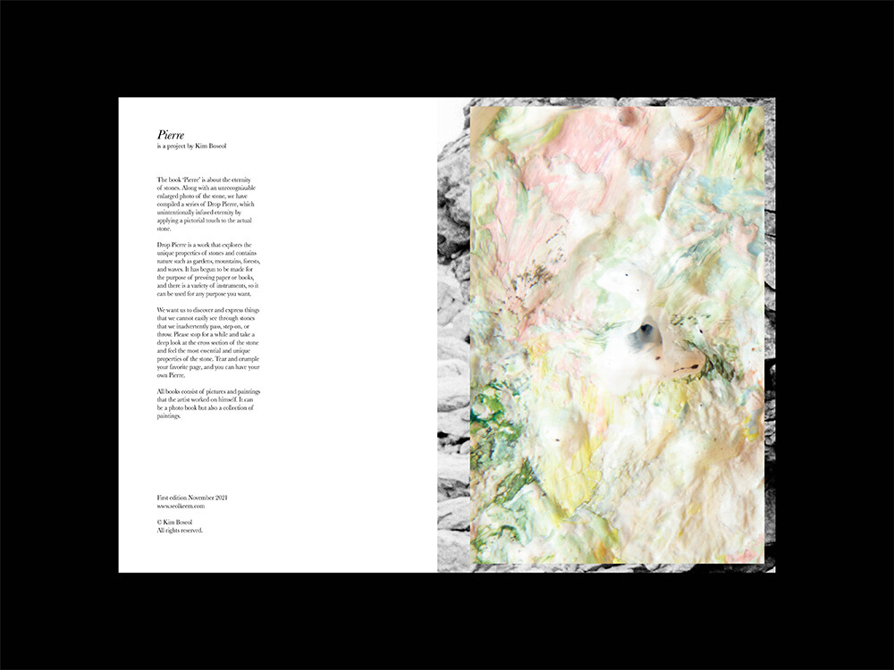 『Pierre』는 돌의 영원성에 대해서 이야기하는 책입니다. 돌의 단면을 알아볼 수 없을 정도로 확대한 필름 사진과 함께 실제 돌에 회화적인 터치를 입혀 타의적으로 영원성을 불어넣은 ‘Drop Pierre’ 시리즈를 한 권에 엮었습니다. 무심코 지나치거나 밟고, 또는 던지는 돌을 통해 우리가 쉽게 보지는 못하는 것들을 발견하고 또 표현하고자 했습니다. 이 책은 사진집이면서 화집이 될 수 있습니다. 직접 마음에 드는 페이지를 찢어 구겨내면 하나뿐인 나만의 피에르를 가질 수 있습니다.