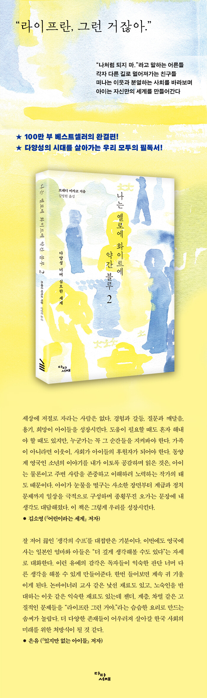 『나는 옐로에 화이트에 약간 블루 2』는 칼럼니스트 브래디 미카코의 최신작이자 『나는 옐로에 화이트에 약간 블루』의 후속편이다. 전작에서 긴축 재정 시대의 영국에서 백인 노동자 계급 중학교에 입학한 아들이 겪는 다양성과 차별의 복잡 미묘한 문제를 다룬 저자는, 이번 책에서 다양성 이면에 존재하는 층위와 모순을 지적한다. 브렉시트로 분열된 영국 사회의 적나라한 현실과 어느새 사춘기를 맞이한 아들의 학교생활을 미시와 거시를 넘나드는 냉철한 시선으로 묘사한다.