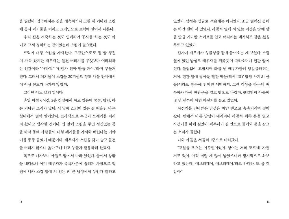 “하지만 ‘라이프’란, 그런 거잖아. 후회하는 날도 있다가 후회하지 않는 날도 있다가. 그게 계속 반복되는 거 아냐?” ‘인생’이라고 번역하고 싶지 않을 만큼 열세 살 아들이 ‘라이프’ 같은 말을 하는 건 너무 시기상조로 느껴졌다. 하지만 이런 말을 할 만큼 지금 아들의 ‘라이프’에는 내가 모르는 곳에서 이런저런 일들이 일어나고 있겠구나 생각했다. 그리고 아들은 더 이상 그 일을 내게 들려주지 않는다.