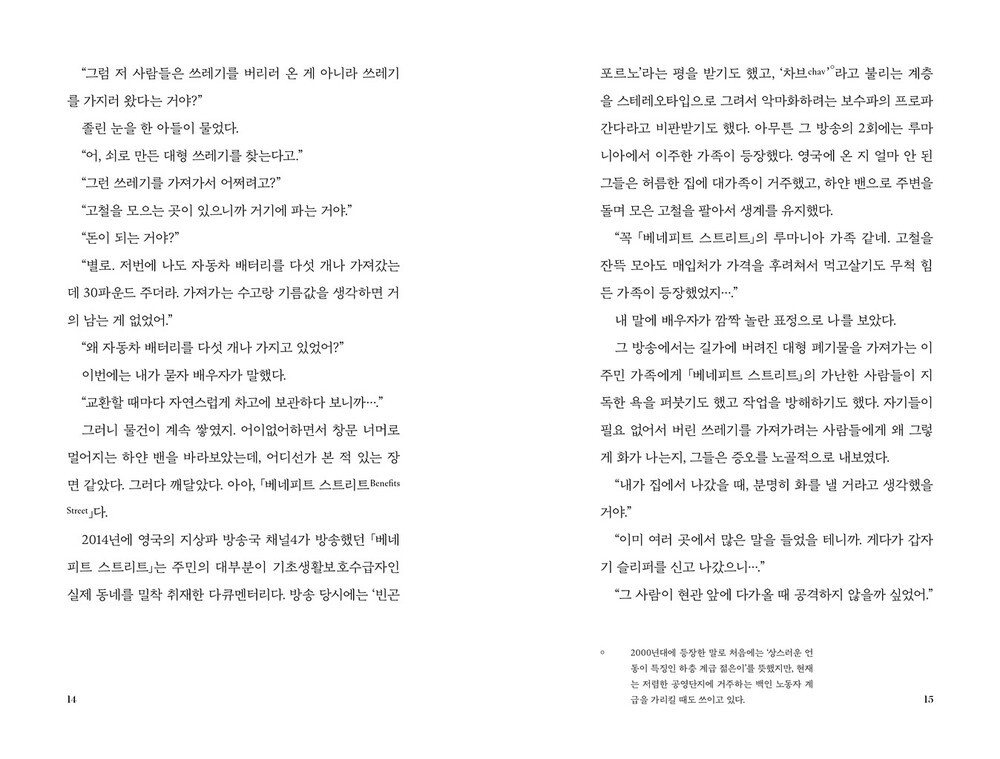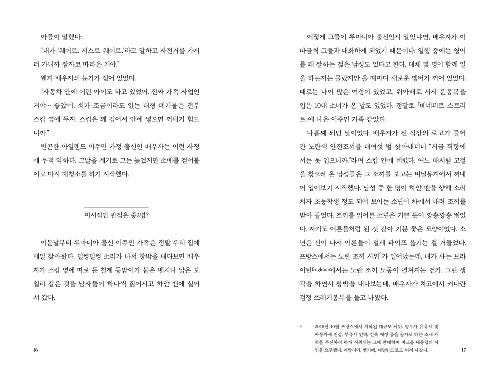 시대가 바뀌듯이 일상의 풍경도 변한다. 동네에는 공영주택이었던 집을 근사하게 개조한 젊은이들이 들어오고 노동자 계급 이웃은 집을 팔고 떠나간다. “나처럼 되지 마.”라고 말하는 노동자 계급 어른들의 마을은 이제 사라져간다.