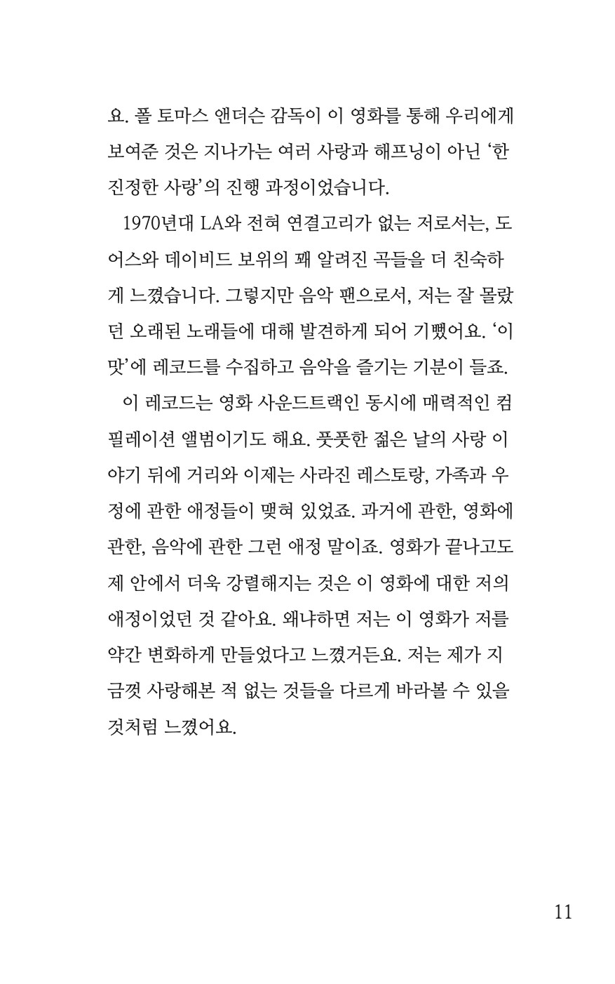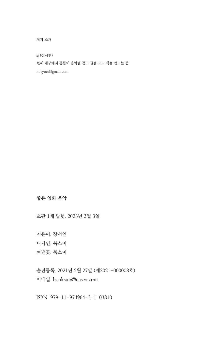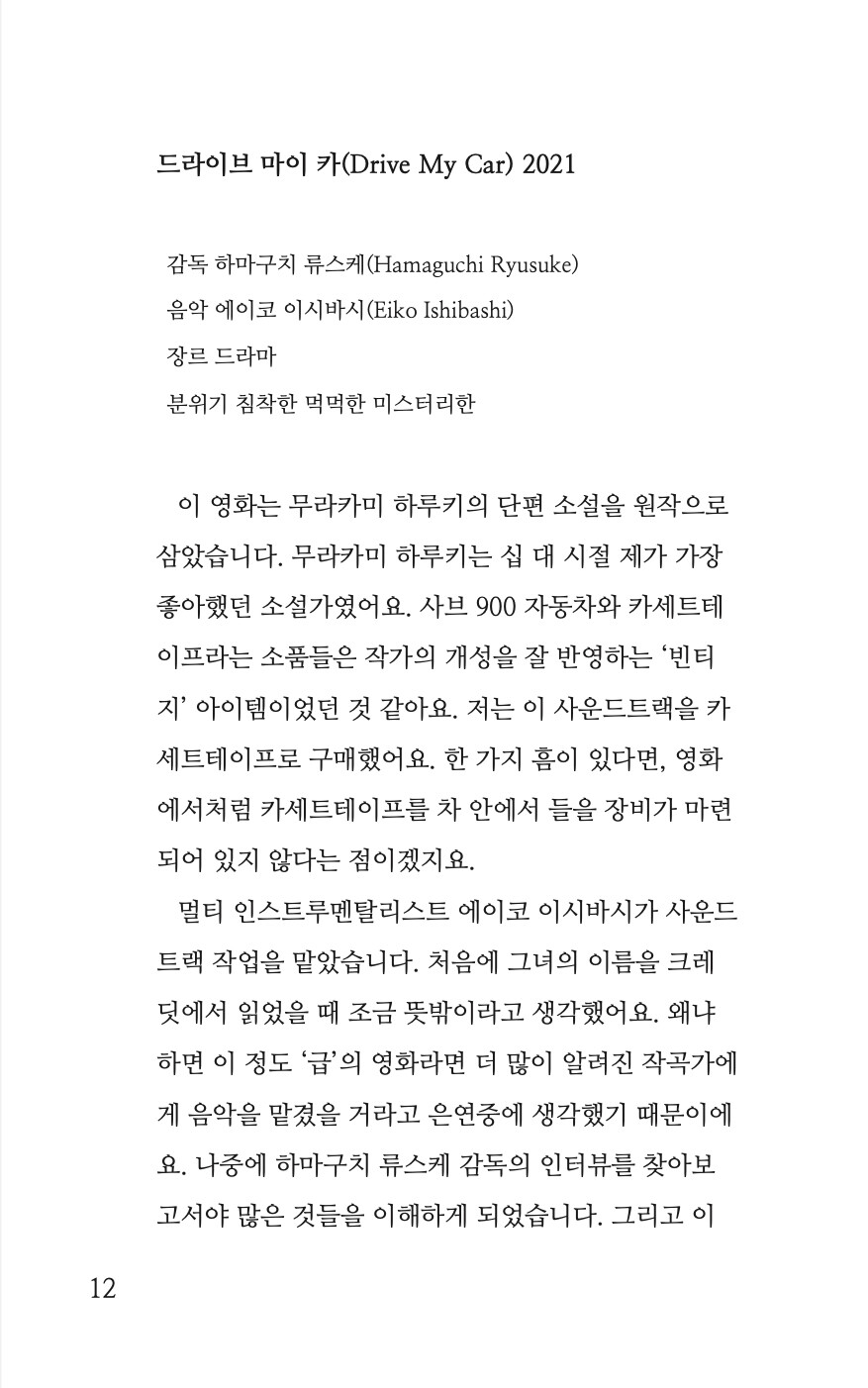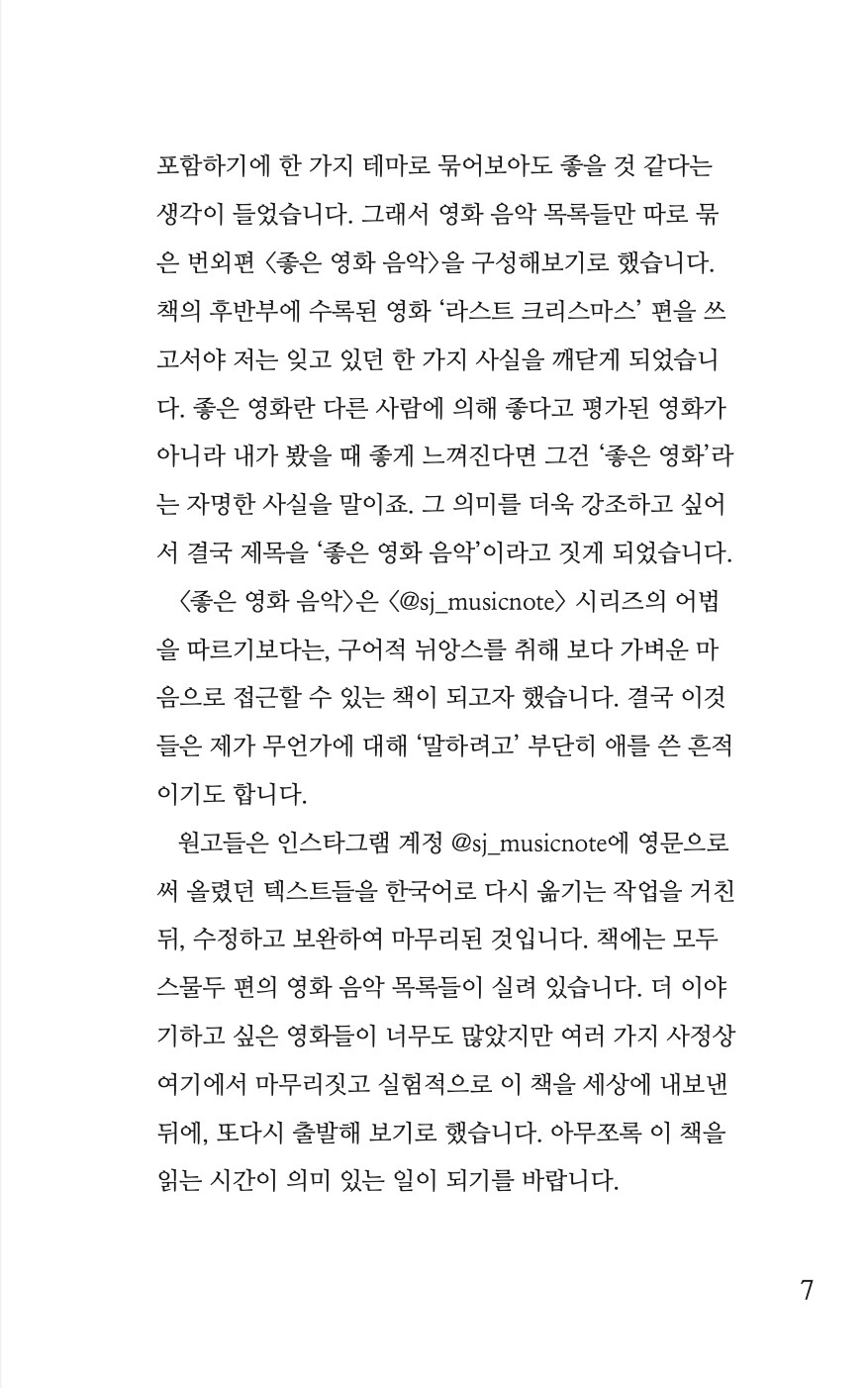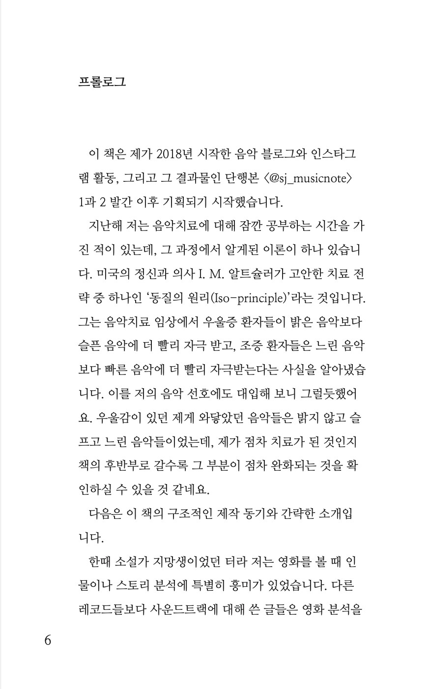 (p.6 프롤로그 중에서)한때 소설가 지망생이었던 터라 저는 영화를 볼 때 인물이나 스토리 분석에 특별히 흥미가 있었습니다. 다른 레코드들보다 사운드트랙에 대해 쓴 글들은 영화 분석을 포함하기에 한 가지 테마로 묶어보아도 좋을 것 같다는 생각이 들었습니다. 그래서 영화 음악 목록들만 따로 묶은 번외편 <좋은 영화 음악>을 구성해보기로 했습니다. 책의 후반부에 수록된 영화 ‘라스트 크리스마스’ 편을 쓰고서야 저는 잊고 있던 한 가지 사실을 깨닫게 되었습니다. 좋은 영화란 다른 사람에 의해 좋다고 평가된 영화가 아니라 내가 봤을 때 좋게 느껴진다면 그건 ‘좋은 영화’라는 자명한 사실을 말이죠. 그 의미를 더욱 강조하고 싶어서 결국 제목을 ‘좋은 영화 음악’이라고 짓게 되었습니다.<좋은 영화 음악>은 <@sj_musicnote> 시리즈의 어법을 따르기보다는, 구어적 뉘앙스를 취해 보다 가벼운 마음으로 접근할 수 있는 책이 되고자 했습니다. 결국 이것들은 제가 무언가에 대해 ‘말하려고’ 부단히 애를 쓴 흔적이기도 합니다.