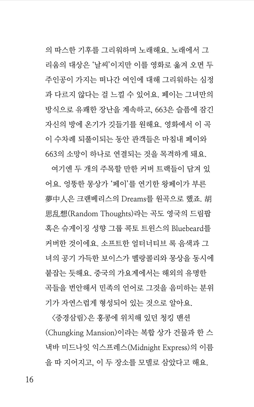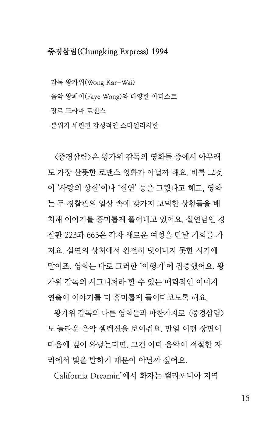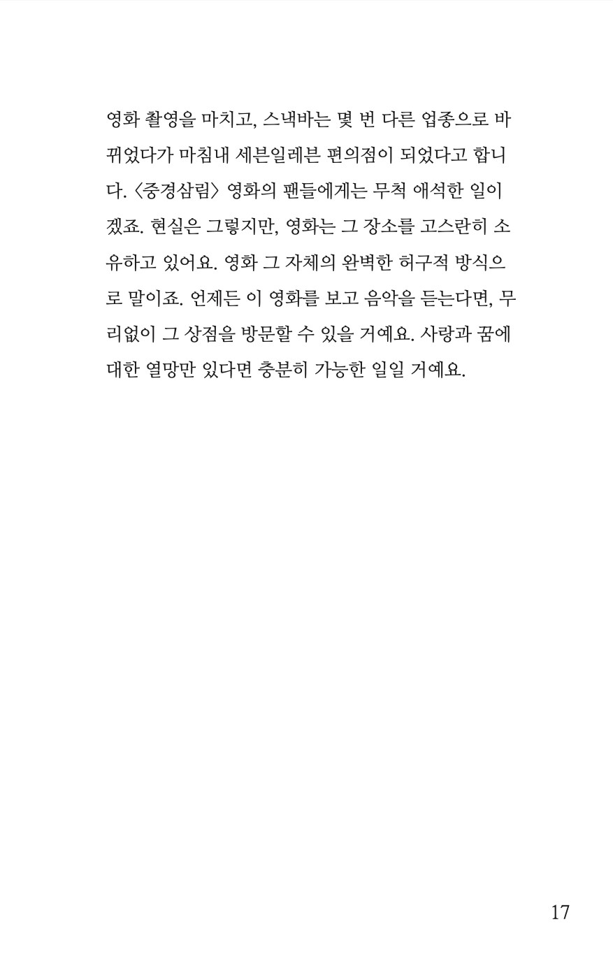 (p.17 <중경삼림> 중에서)<중경삼림>은 홍콩에 위치해 있던 청킹 맨션(Chungking Mansion)이라는 복합 상가 건물과 한 스낵바 미드나잇 익스프레스(Midnight Express)의 이름을 따 지어지고, 이 두 장소를 모델로 삼았다고 해요. 영화 촬영을 마치고, 스낵바는 몇 번 다른 업종으로 바뀌었다가 마침내 세븐일레븐 편의점이 되었다고 합니다. <중경삼림> 영화의 팬들에게는 무척 애석한 일이겠죠. 현실은 그렇지만, 영화는 그 장소를 고스란히 소유하고 있어요. 영화 그 자체의 완벽한 허구적 방식으로 말이죠. 언제든 이 영화를 보고 음악을 듣는다면, 무리없이 그 상점을 방문할 수 있을 거예요. 사랑과 꿈에 대한 열망만 있다면 충분히 가능한 일 일 거예요.