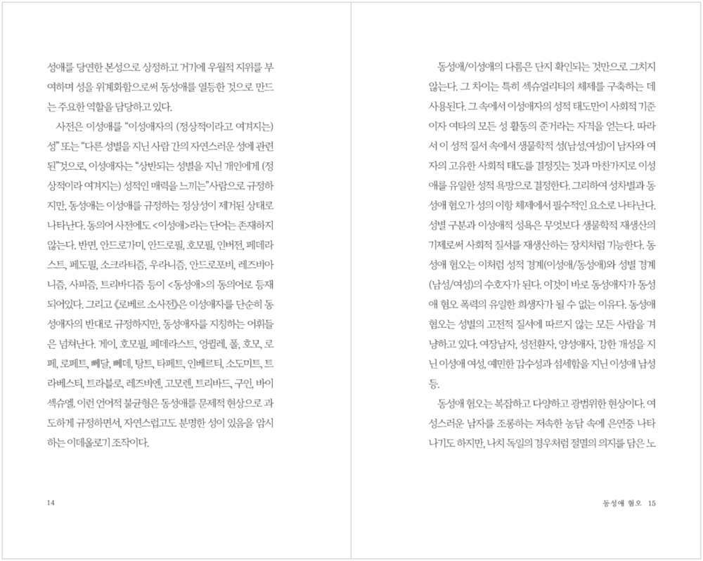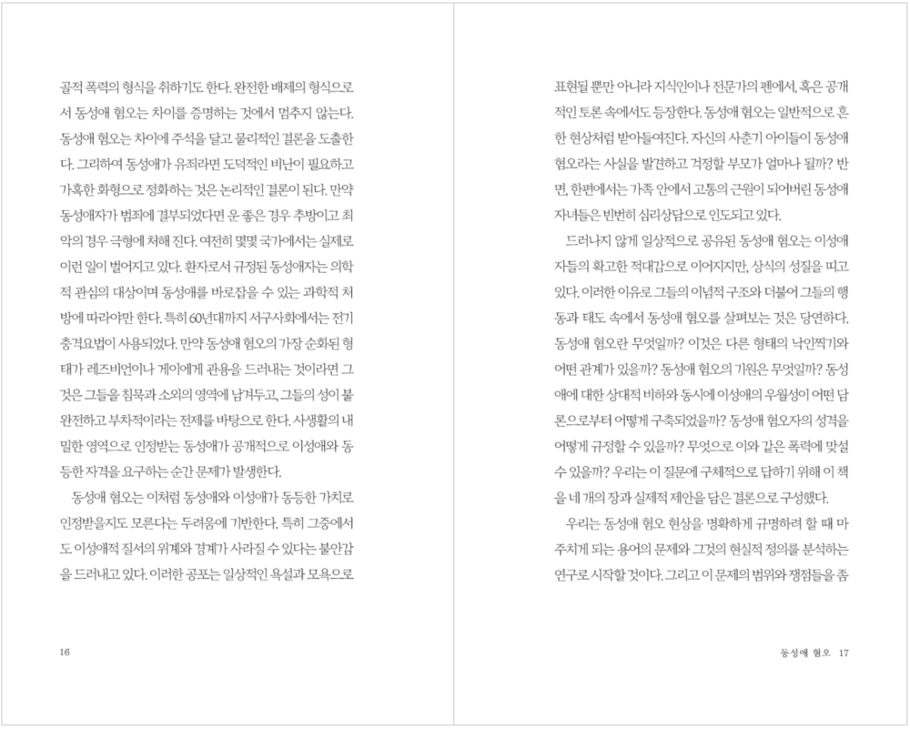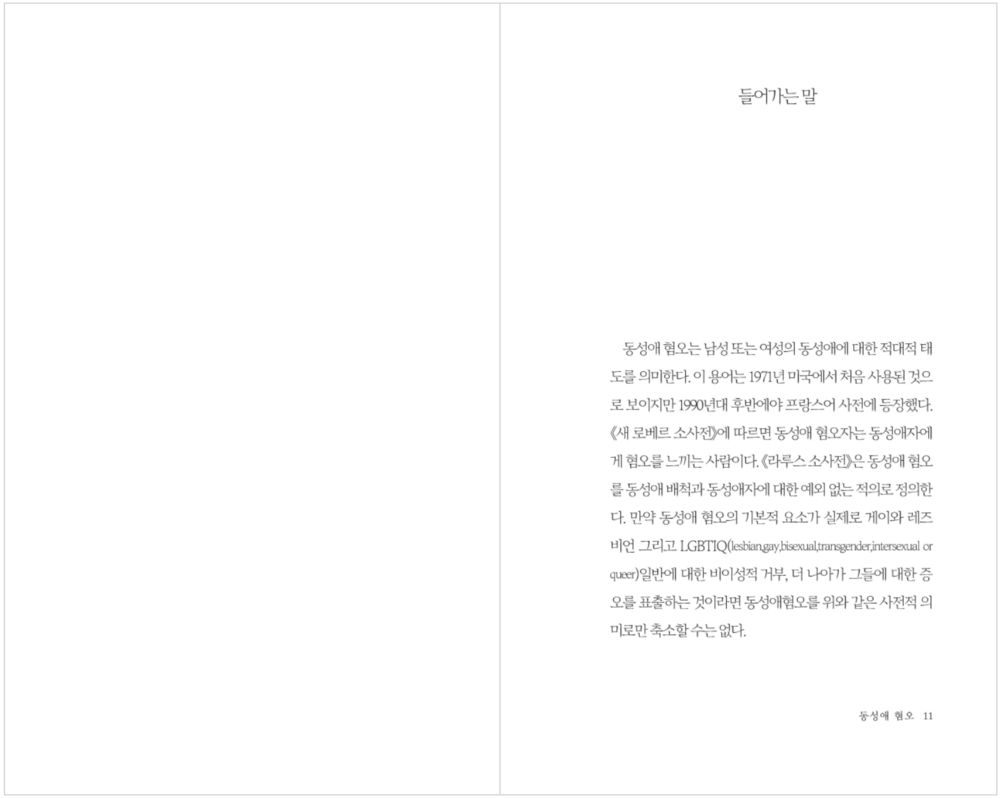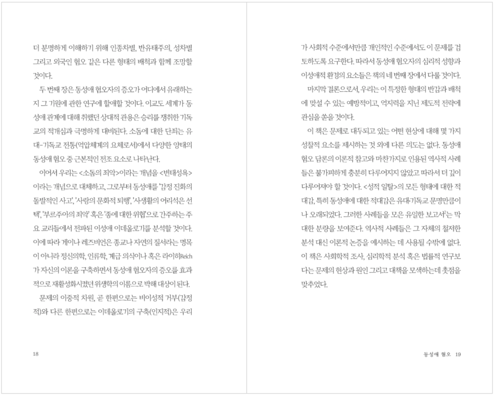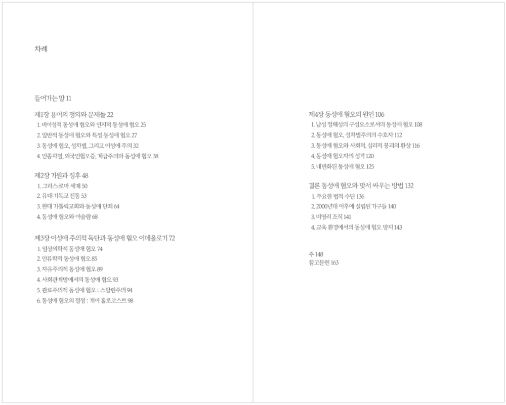 우선 첫 장에서는 동성애 혐오를 세부적으로 구분한다. 비이성적인 동성애 혐오와 완곡하게 표현되는 사회적 유형의 인지적 동성애 혐오, 그리고 동성애 일반에 대한 혐오와 특정 성의 동성애 혐오를 구분하고, 동성애 혐오에서 성차별, 이성애 주의, 인종차별, 외국인 혐오, 계급주의 요소들을 발견해낸다.