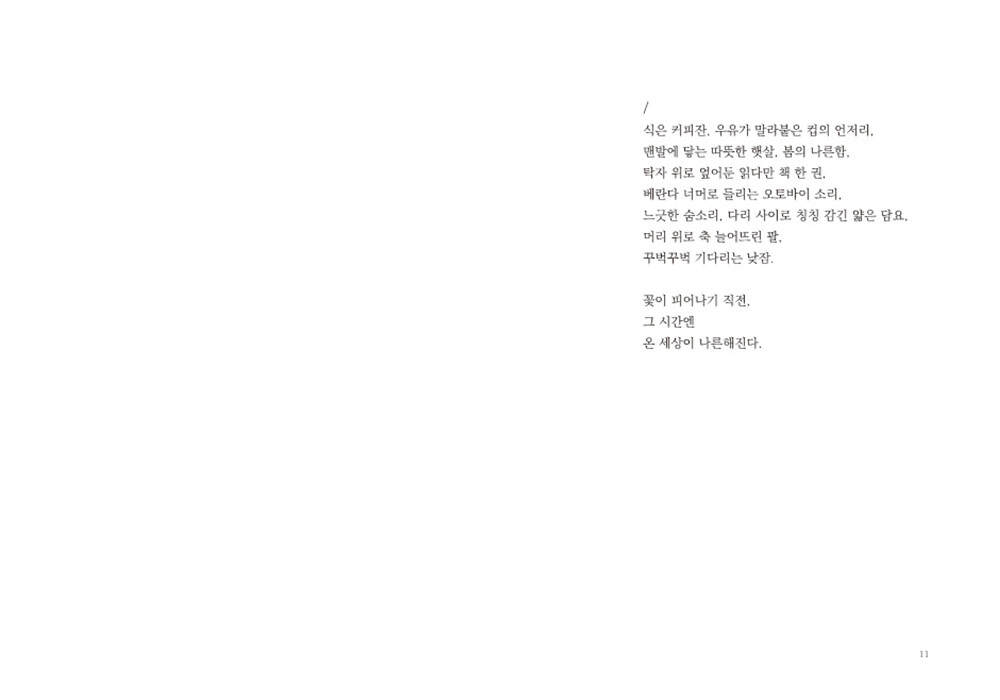 식은 커피잔, 우유가 말라붙은 컵의 언저리, 맨발에 닿는 따뜻한 햇살, 봄의 나른함, 탁자 위로 엎어둔 읽다만 책 한 권. 꽃이 피어나기 직전, 그 시간엔 온 세상이 나른해진다.