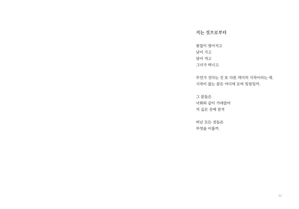 꽃잎이 떨어지고 낮이 가고 달이 지고 그녀가 떠나고. 무언가 진다는 건 또 다른 의미의 시작이라는데. 시작이 없는 끝은 어디에 모여 일렁일까.
