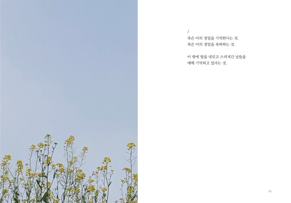죽은 이의 생일을 기억한다는 것. 죽은 이의 생일을 축하하는 것. 이 땅에 발을 내딛고 스러져간 날들을 매해 기억하고 있다는 것.