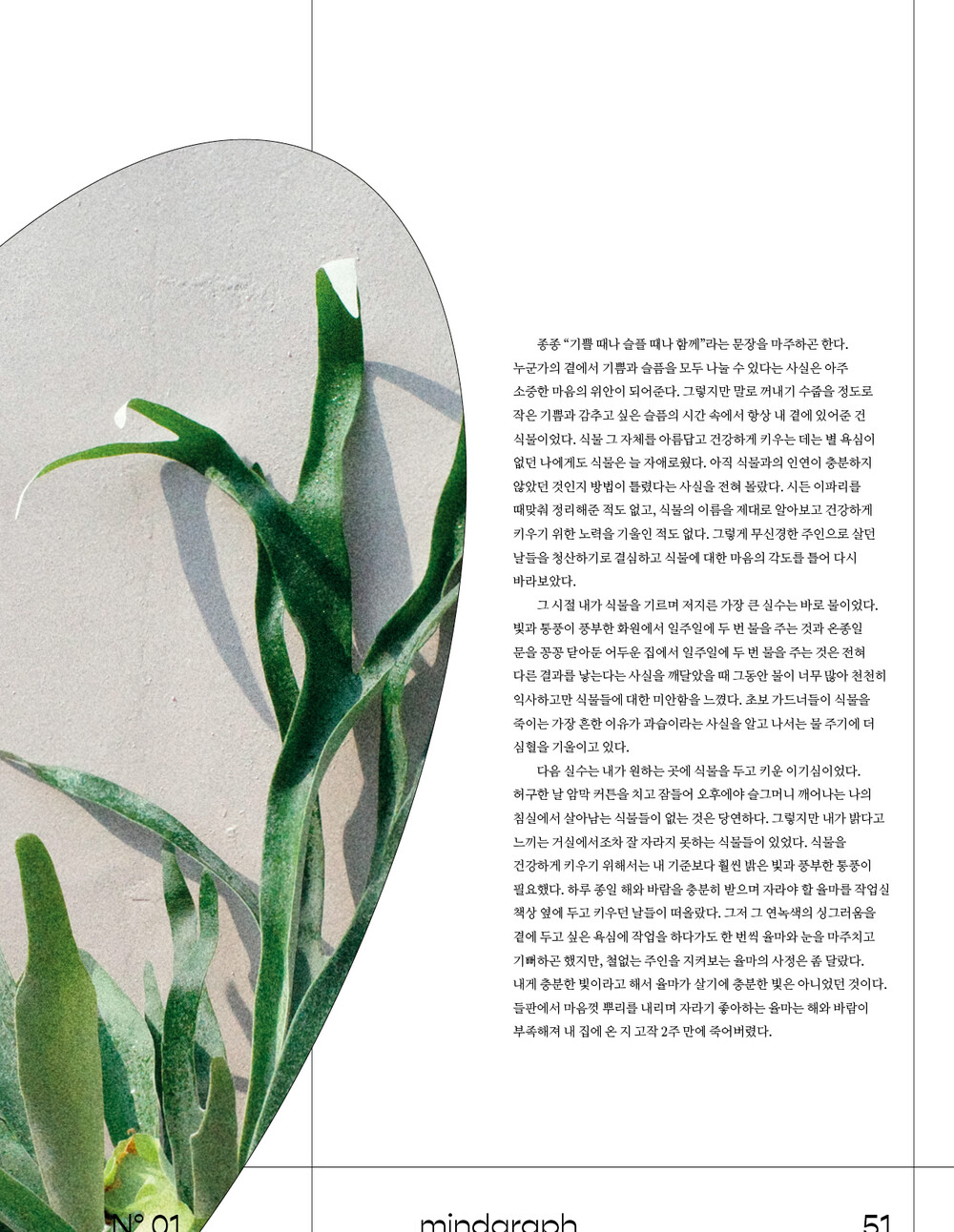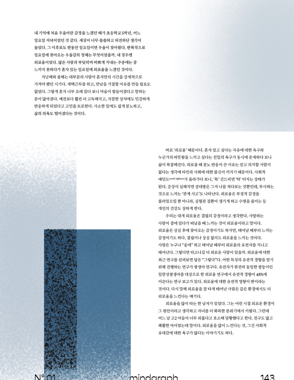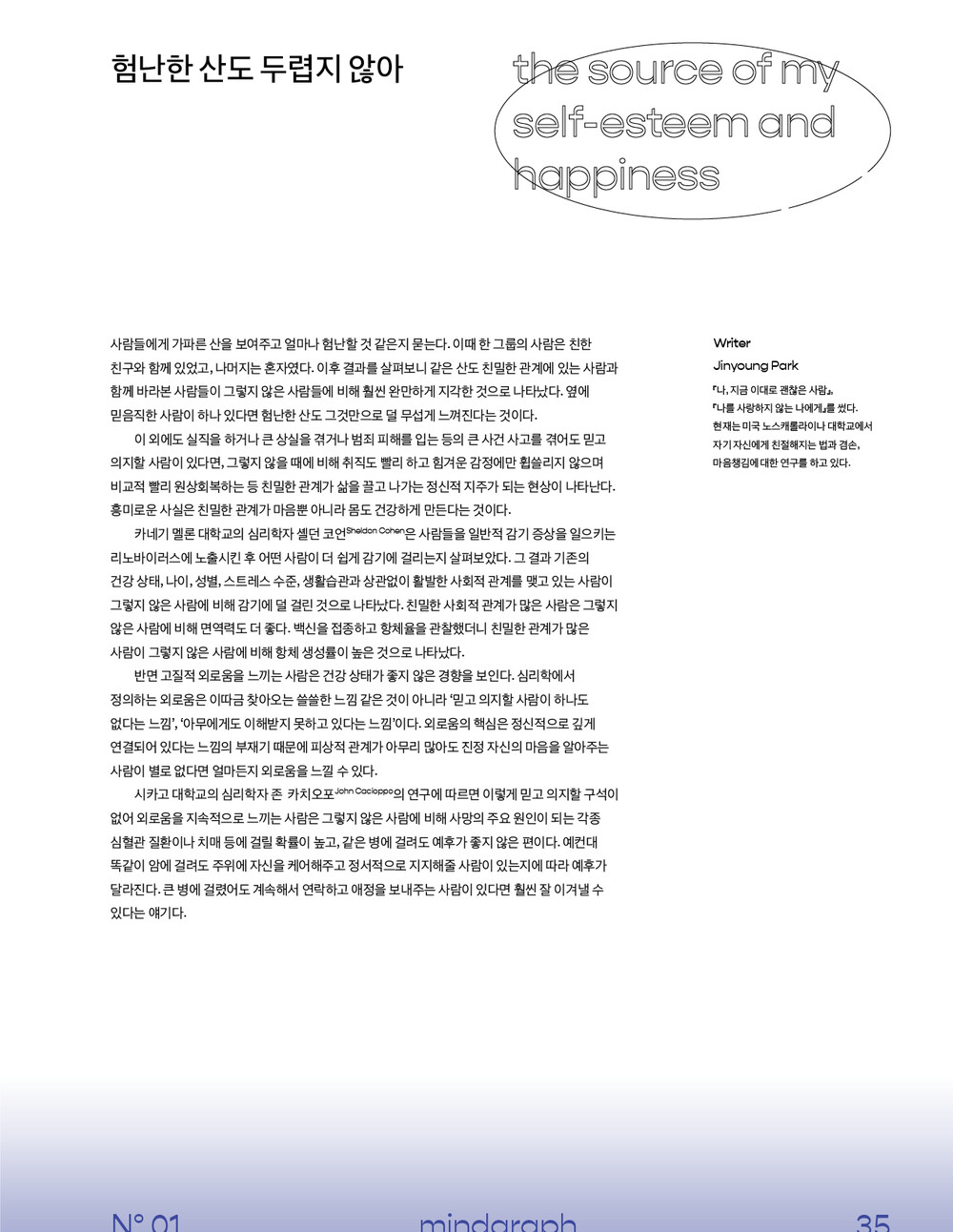 마음 건강을 위한 셀프케어 매거진매거진 〈마인드그라프〉 1호의 주제는 ‘곁 ’입니다.나를 사랑하고 내가 사랑하는 존재들. 우리는 그들과 함께 서로의 곁에 있어 주고, 곁을나누고, 곁을 내어주며 살아갑니다. 우리 곁의 소중한 이들과 이루는 정서적 친밀함은 친구,가족, 연인 그리고 반려동물과 식물의 관계에서도 존재합니다.가까운 누군가와 곁을 나누는 일은 우리의 마음에 안정을 주고, 자존감을 강화하며, 세상에 대한 믿음을 지켜줍니다. 우리의 삶은 결코 혼자가 아니며, 서로의 존재만으로도 충분히서로의 ‘곁’이 되어줄 수 있습니다.이번 창간호는 서로에게 ‘곁’이 되어주는 나와 가까운 대상 사이에서 일어나는 다양한감정과 관계의 이야기를 통해, ‘친밀한 존재’가 우리의 삶에 미치는 다양한 긍정적 영향에대해 탐구합니다.