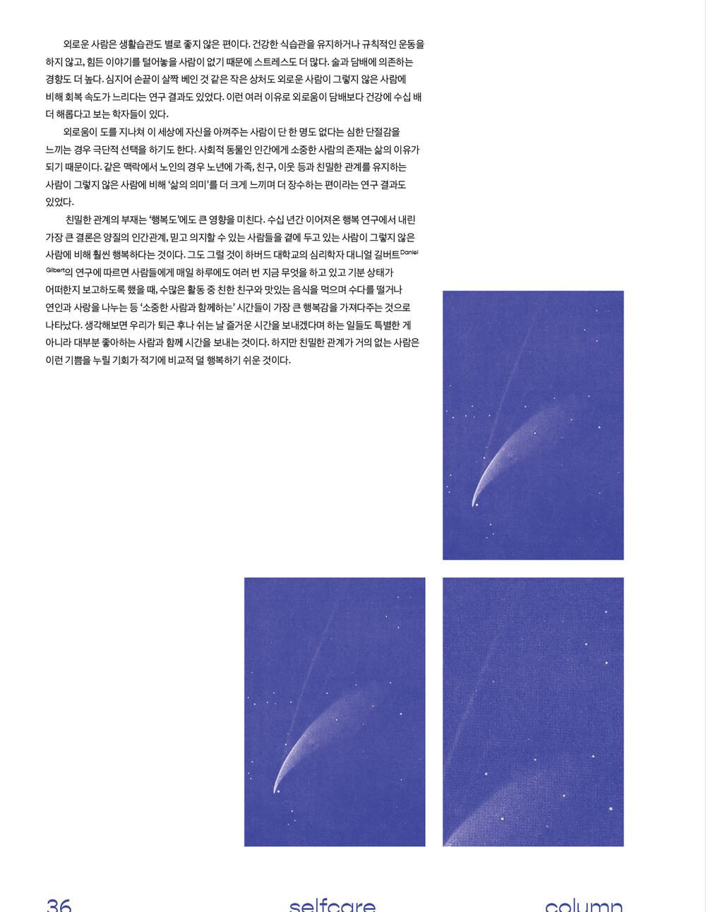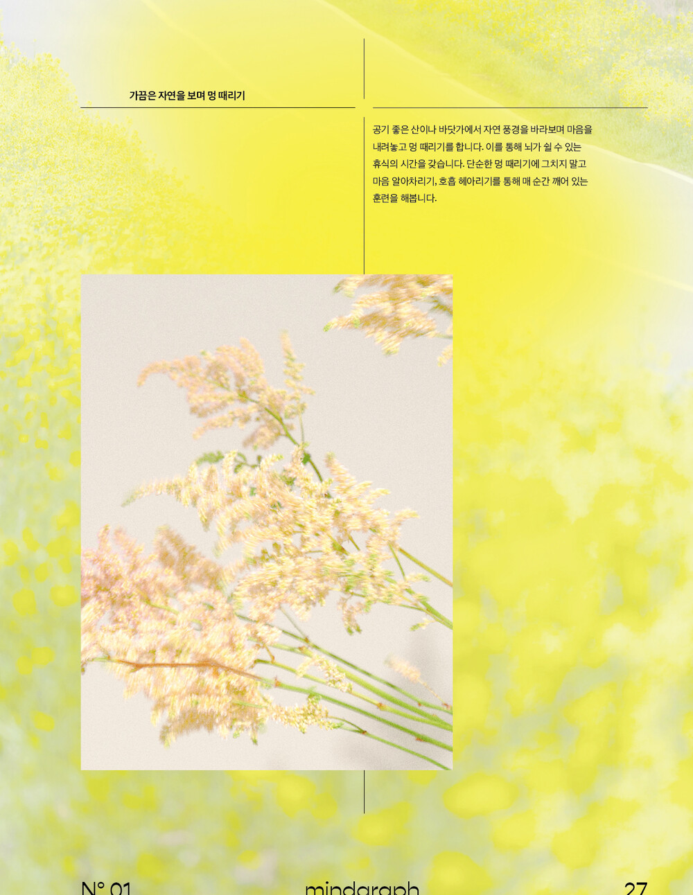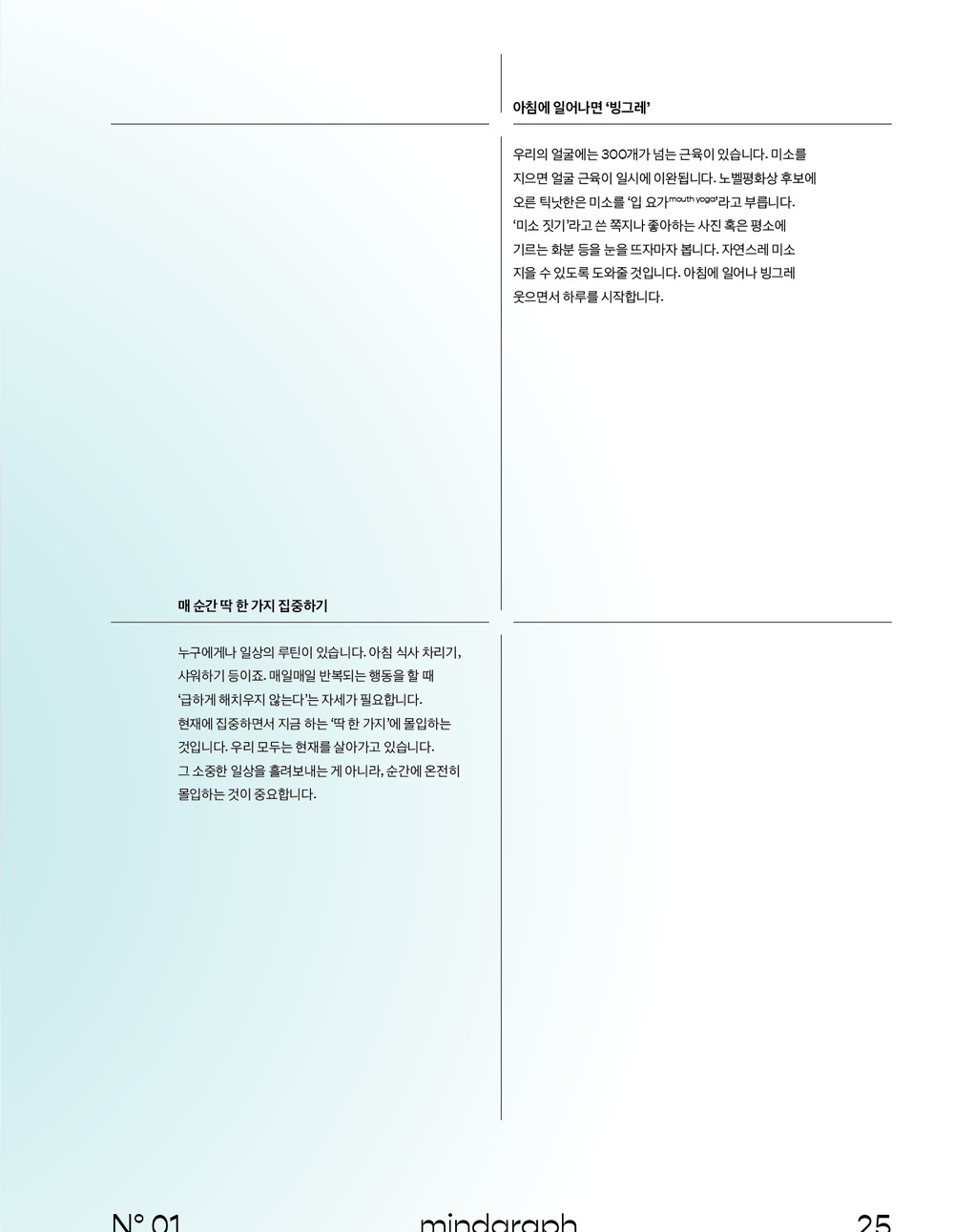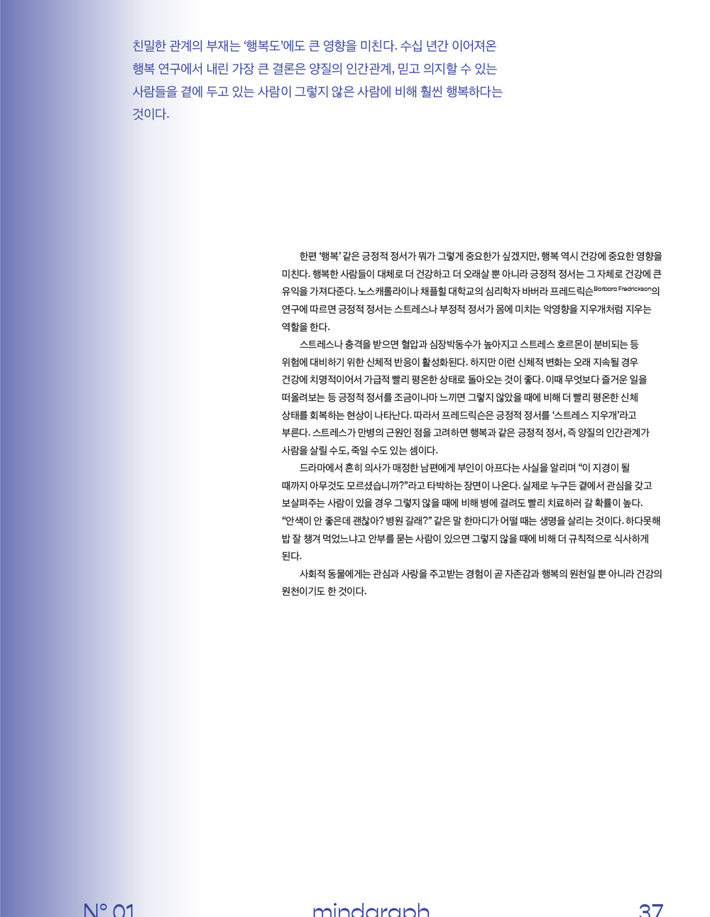 마음 건강을 위한 셀프케어 매거진매거진 〈마인드그라프〉 1호의 주제는 ‘곁 ’입니다.나를 사랑하고 내가 사랑하는 존재들. 우리는 그들과 함께 서로의 곁에 있어 주고, 곁을나누고, 곁을 내어주며 살아갑니다. 우리 곁의 소중한 이들과 이루는 정서적 친밀함은 친구,가족, 연인 그리고 반려동물과 식물의 관계에서도 존재합니다.가까운 누군가와 곁을 나누는 일은 우리의 마음에 안정을 주고, 자존감을 강화하며, 세상에 대한 믿음을 지켜줍니다. 우리의 삶은 결코 혼자가 아니며, 서로의 존재만으로도 충분히서로의 ‘곁’이 되어줄 수 있습니다.이번 창간호는 서로에게 ‘곁’이 되어주는 나와 가까운 대상 사이에서 일어나는 다양한감정과 관계의 이야기를 통해, ‘친밀한 존재’가 우리의 삶에 미치는 다양한 긍정적 영향에대해 탐구합니다.