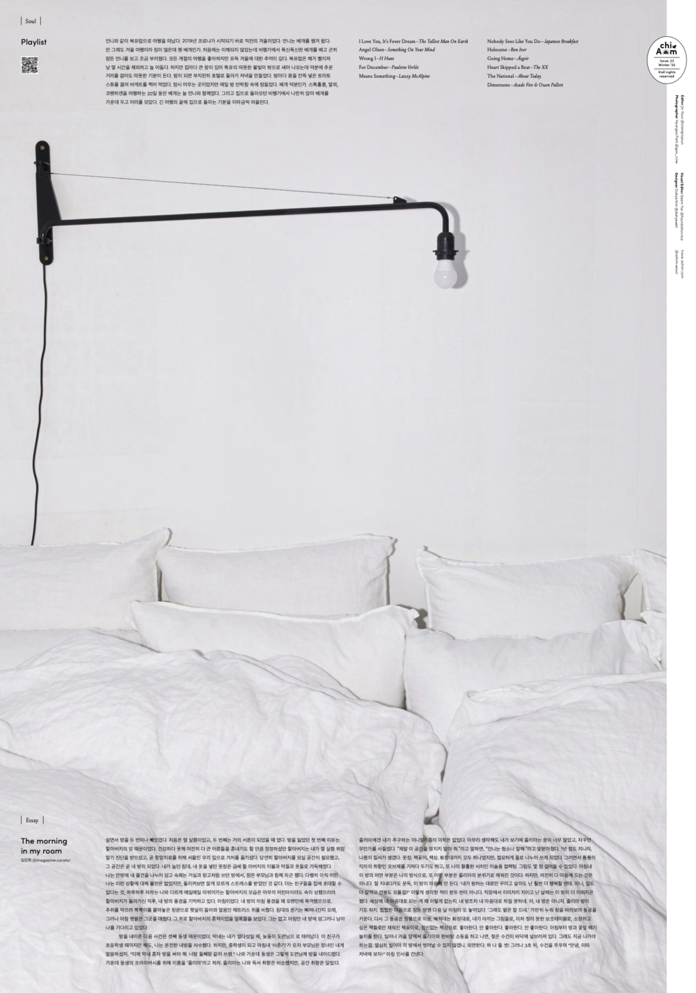일 년에 네 번 발행되는 계간지입니다. 활짝 펼치면 신문과 같은 타블로이드 판형이며 매 호 각 주제에 맞는 사진을 담은 엽서 두세 장이 함께합니다. 아침을 바탕으로 매 호 다른 주제를 가지고 있습니다. 주제를 설명하는 비기닝 레터, 다른 사람의 아침을 간접적으로 경험해보는 인터뷰와 에세이, 유머 있게 풀어낸 시리얼 리뷰와 레시피, 아침에 보고 듣고 읽기 좋은 영감 콘텐츠로 구성되어 있습니다.