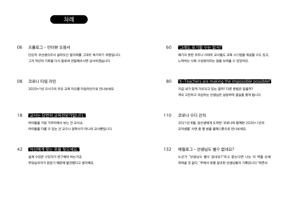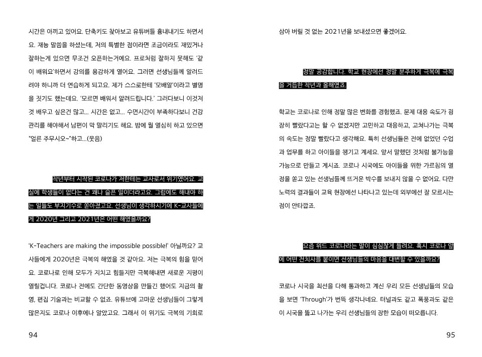 교사들에게 2020년은 극복의 해였을 것 같아요. 저는 극복의 힘을 믿어요. 코로나로 인해 모두가 지치고 힘들지만 극복해내면 새로운 지평이 열릴겁니다. - 94쪽