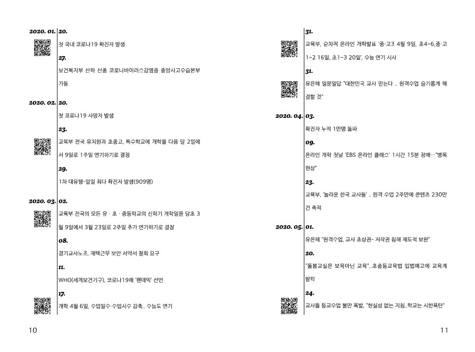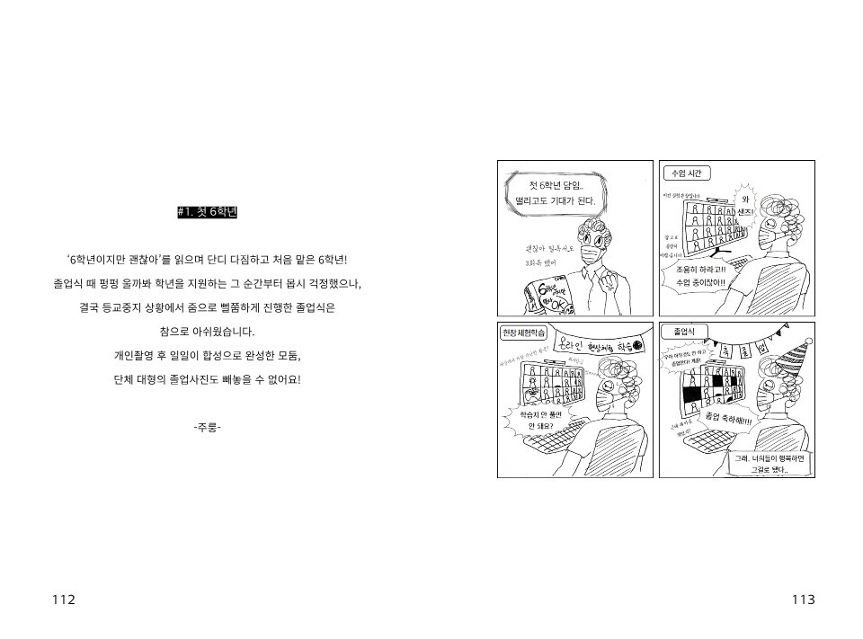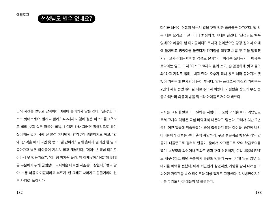 2020년 3월은 아무것도 정해지지 않았었죠. 모두가 혼란했고, 코로나가 길어질 거란 예상을 안 했던 것 같아요. 교육과정만 조금 조절하면 되지 않을까 하면서. 개국한 이래 처음으로 3월에 개학을 못 한 해라고 하더라고요. 저 역시 3월 2일인데 아이들이 없다는 게 상당히 낯설었죠. - 53쪽