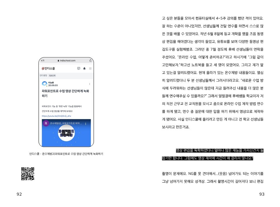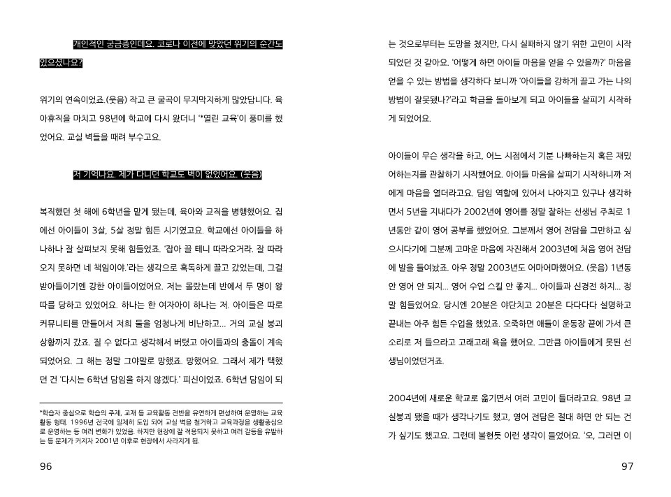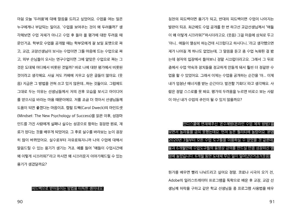 예기치 못한 코로나 사태로 교사들도 콘텐츠를 제작할 능력이 있고, 협업을 통해 교육 시스템을 제공할 수도 있고, 노력하는 사회 구성원이라는 점을 보여줄 수 있었어요. 선생님을 소위 철밥통이라고 폄하하는 사람들이 많은데, 아시다시피 정말 고생 많이 하잖아요? - 72쪽