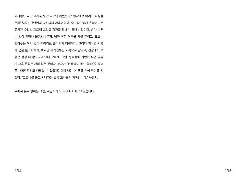 「Zero to Hero - 코로나를 뚫고 지나가는 초등교사들」에서는 2020+1년 코시국에서 써 내려간 선생님들의 이야기를 모았습니다. 교육 정책을 개발하거나 학문적 영향을 끼치고자 하는 원대하고 생산적인 의도는 전혀 없으며, 단순히 코선생의 발자취를 그대로 복기하고자 했습니다. 교육 현장에 미친 코로나-19의 영향과 이를 발판 삼아 성장한 초등교사들의 이야기를 만나보시기 바랍니다.