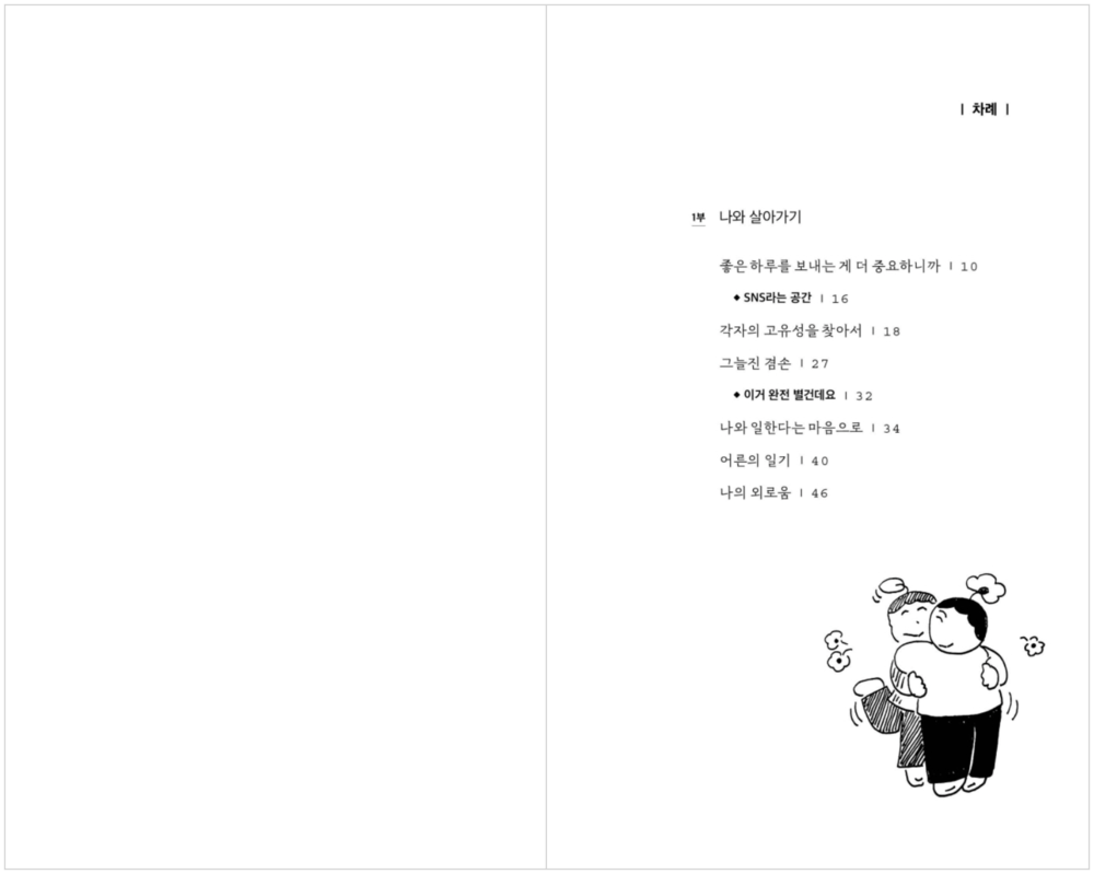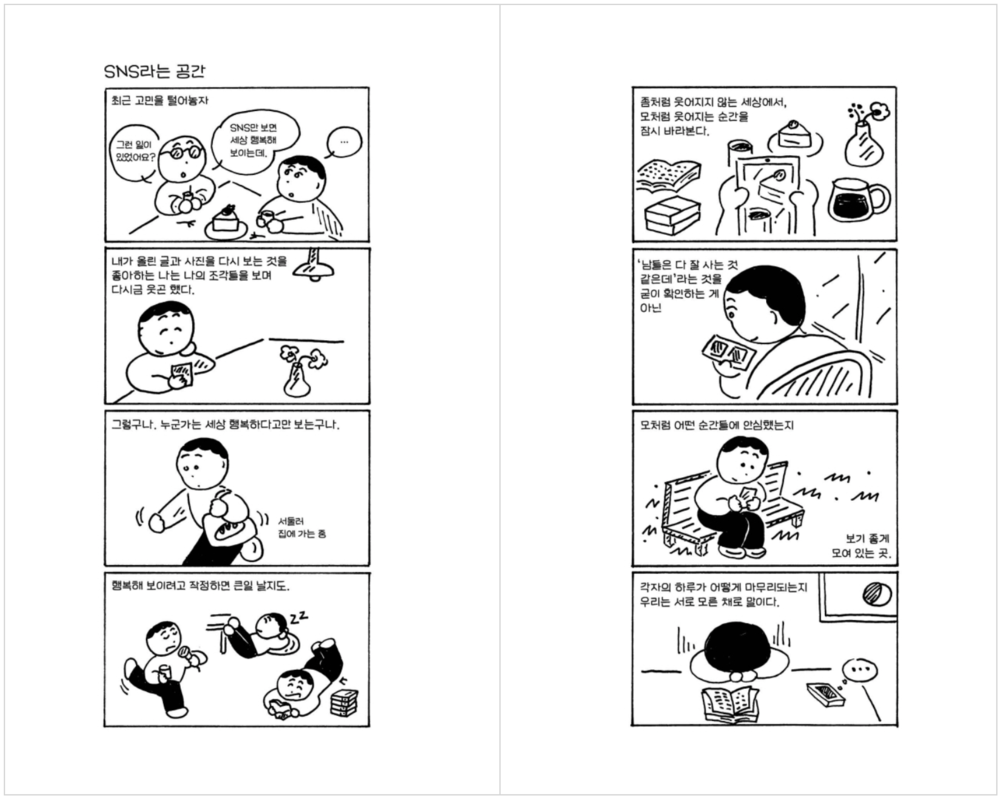 총 5부로 구성된 이 책에는 중간중간 저자가 직접 그린 카툰도 여덟 편 수록되어 있어 독자들에게 또 다른 재미를 선사할 것이다. 본문과 연장선상에 있으면서도 본문에서 다루지 않은 새로운 에피소드를 담고 있는 이 카툰들을 보고 있으면 일상의 갈피 속에 숨어 있는, 그래서 대부분 무신경하게 지나치기 마련인 것들이 동글동글한 선과 무해해 보이는 인물들 사이로 뾰족하게 얼굴을 내밀 것이다.