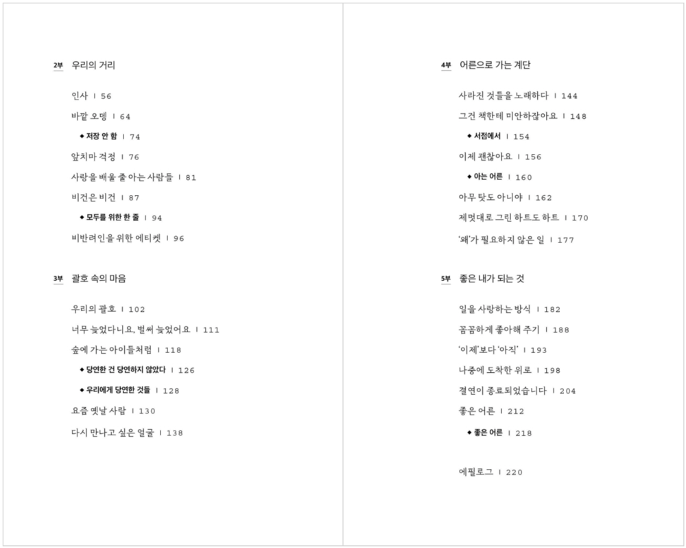 좋은 어른은 좋은 내가 되었을 때 반짝일 수 있는 힘이 아닐까. 좋은 어른이 된다는 것은 자신의 이야기를 잃지 않고 계속 걸어가는 데서 시작하는 것이 아닐까. 좋은 어른이 되기 위해 말을 고르지 않고, 좋은 어른으로 보이려고 애써 당당한 표정을 짓지 않고, 계속해서 나와 가까워지는 삶을 살아 낼 때 나도 모르게 누군가에게 좋은 어른으로서 존재하는 것이 아닐까.(215쪽)