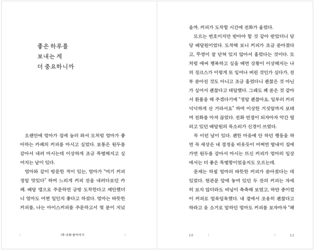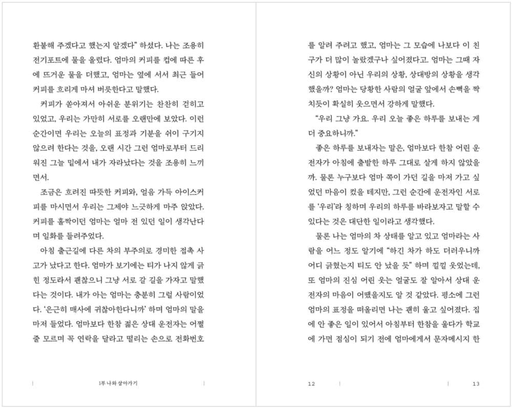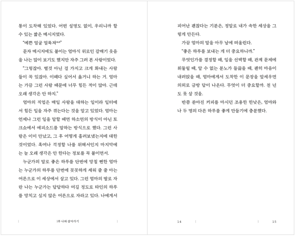 가령 첫 번째 꼭지인 「좋은 하루를 보내는 게 더 중요하니까」에서 아침 출근길에 타인의 과실로 접촉 사고가 났음에도 사고를 내어 당황한 상대방을 보며 “우리 그냥 가요. 우리 오늘 좋은 하루를 보내는 게 더 중요하니까”라는 말로 넘어간 엄마의 에피소드는 놀라우면서도 인상적이다. 그런 상황에서 자신의 상황보다는 상대방의 상황을 더 염두에 두고, 상대방을 ‘우리’라고 일컬으며 서로 갈 길을 가자고 하는 엄마의 모습에서 타인의 하루는 물론 자신의 하루도 망치고 싶어 하지 않는 마음을 엿볼 수 있다.