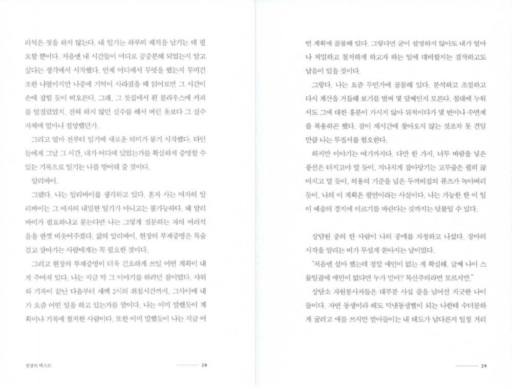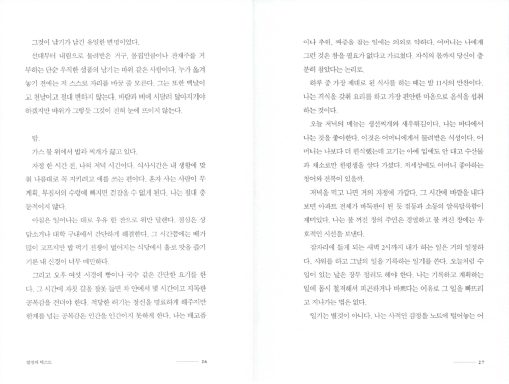 나는 이제까지 한 번도 내가 이 땅의 사람들과 같은 조건으로 살고 있다고 생각해 본 적이 없다. 조건이라는 말에서 다소의 불순함이 풍긴다면 기꺼이 태도라는 말로 바꿀 용의가 있다.