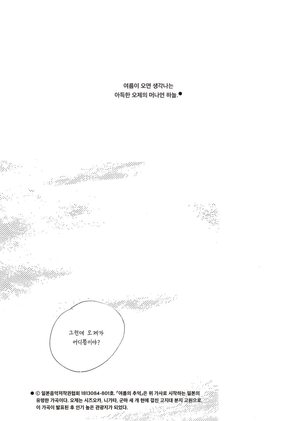 그날은 밤을 새워 일하다가 겨우 정신을 차렸더니 시곗바늘이 4시를 지난 참이었다. 이시이 유코가 일을 도와주려고 와 있었다. 지칠 대로 지쳤는데도 전혀 졸리지는 않았다. 이시이도 그런 모양이었다. 커피라도 마시려고 밖으로 나가봤다. 인적 드문 밤거리를 지나 도넛 가게에 들어서자마자 ‘그렇지, 거기 가보는 거 어떨까.’ 하는 생각이 스쳤다. 동네에서 가장 높다란 맨션에 몰래 들어가기로 마음먹은 것이다. 흠칫흠칫 떨며 정문을 지나 유리문을 열었다. 관리인실을 곁눈질로 살펴 아무도 없는 것을 확인하는 일도 잊지 않았다. 엘리베이터에 올라타 최고층 버튼을 눌렀다. 덜컹 하던 기계음. 손에는 따끈한 도넛과 뜨끈한 커피를 든 채였다. 문이 열렸다. 숨죽여 통로를 꺾은 우리의 눈앞에 새벽 도쿄의 풍경이 펄쳐졌다. 짙은 남색부터 옅은 푸른빛, 그러다 붉은빛으로 이어지던 그러데이션… 구름은 한 점도 없었다. 하늘을 올려다보면서 읊조렸다. 좋은 아침이다, 좋은 아침이야.