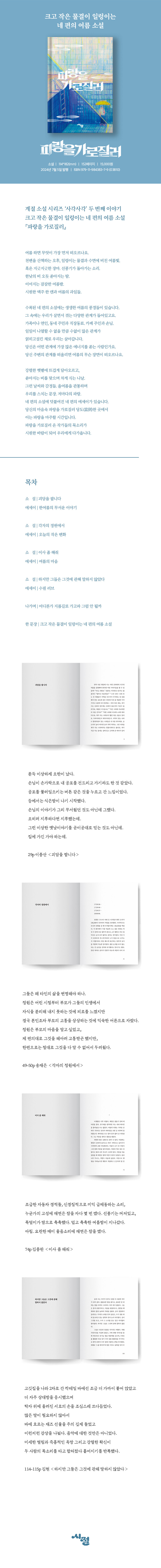 강렬한 햇볕에 뜨겁게 달아오르고, 쏟아지는 비를 맞으며 차게 식는 나날. 그런 날씨와 감정들. 올여름을 관통하며 우리를 스치는 문장. 저마다의 파랑. 네 편의 소설에 덧붙여진 네 편의 에세이가 있습니다. 당신의 마음속 파랑을 가로질러 당도(當到)한 곳에서 이는 파랑을 마주할 시간입니다. 파랑을 가로질러 온 작가들의 목소리가 시원한 바람이 되어 우리에게 다가옵니다.