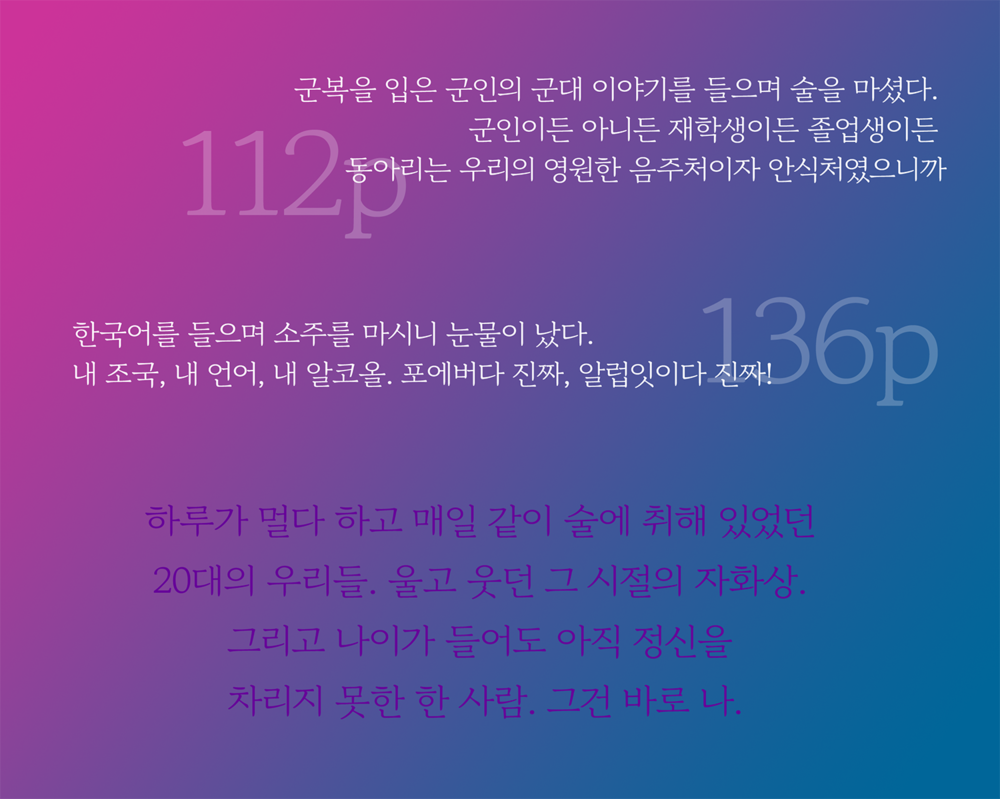 재미도 없고 감동도 없는 인생. 없는 게 어디 그뿐인가 돈도 없고 답도 없다. 이번 생은 망한 것 같은데 아무리 생각해도 그 원인 중 하나가 술인 것 같다고 생각되는 분?! 술로 인한 흑역사가 한 트럭이라서 지난 과거가 후회되는 분?! 술과 가까이 하지 않았다면 인생이 바뀌었을까. 다시 과거로 돌아간다면 과연 술을 멀리하고 지낼 수 있을까. 한 개인의 음주 히스토리를 통해 괴로워하면서도 술을 끊지 못하는 애주가의 삶을 톺아본다. 누구에게나 첫 술은 있다. 술에 눈을 뜨기 시작한 대학 시절을 중점적으로, 술 권하는 회사 생활과 자영업의 삶까지 술잔에 녹아있는 인생사를 엿볼 수 있을 것이다. 카세트테이프로 즐겨듣던 음악과 한일 월드컵, 식섭이송까지 그때 그 시절의 감성을 떠올리게 하는 아이템을 찾아보는 재미와 함께 추억의 앨범을 넘기듯이 책의 페이지를 한 장 한 장 넘겨보자. 20여 년 지속되어 온 저자의 음주생활을 시간순으로 읽어내려가다 보면 백해무익하다는 술이 인류 역사와 함께 발달한 이유를 어쩌면 조금은 이해하게 될지도 모르겠다.
