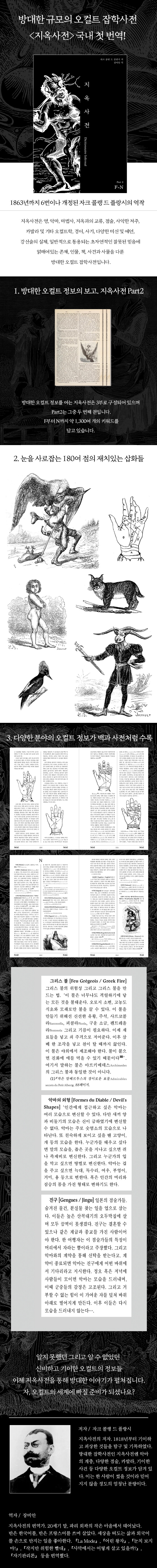 국내 최초로 번역 출판되는 『지옥사전』은 총 세 권으로 구성될 예정입니다. 첫 권은 A부터 E까지의 키워드를, 두 번째 권은 F부터 N까지의 키워드를 다루며 1,300여 개의 오컬트 키워드가 수록됩니다. 각 키워드는 악마, 마녀, 영, 마법사, 점술, 저주, 경이, 다양한 미신, 카발라 등 다양한 정보들을 다루고 있습니다. 아무 페이지나 펴서 넘겨도 흥미로운 정보들이 페이지를 가득 채우고 있습니다. 어디서도 만나보지 못했던 기괴한 이야기들을 지금 읽어보세요!