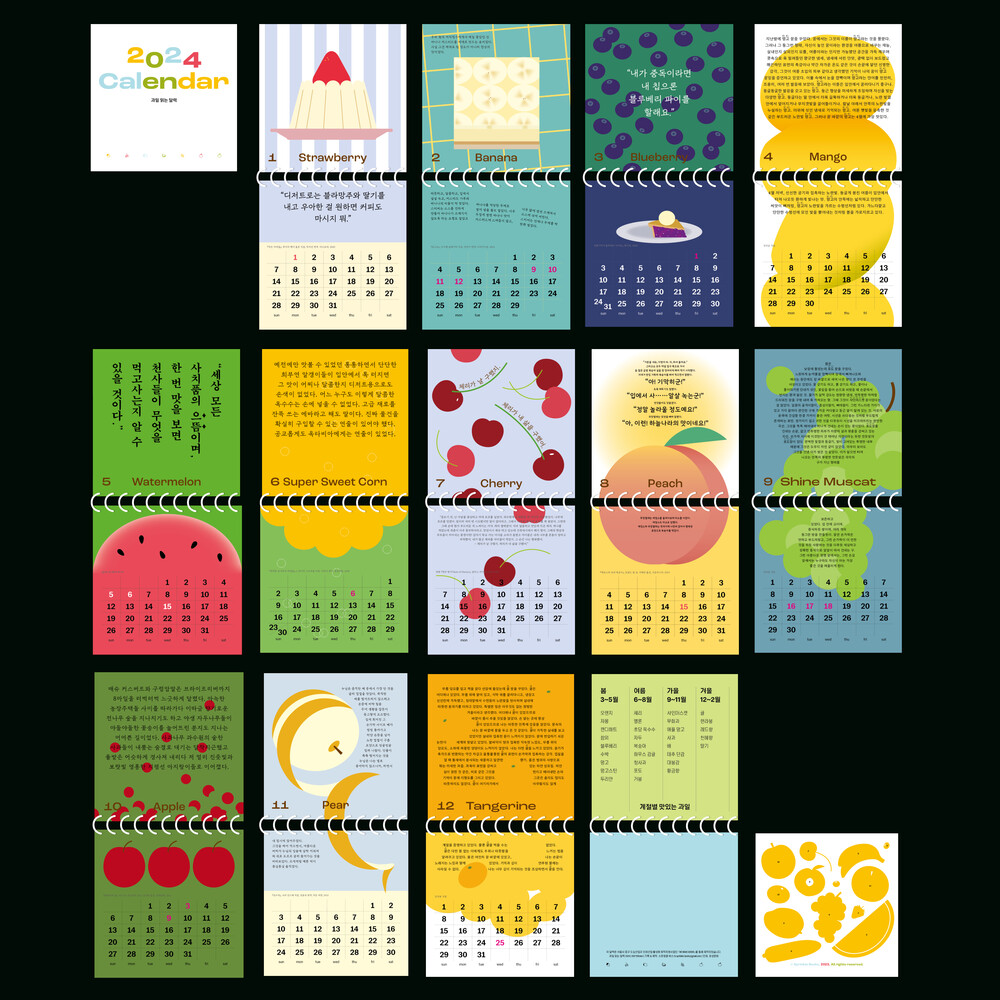 <과일 읽는 달력 2024>는 문학 속에 묘사된 과일, 그리고 과일을 주제로 다룬 짧은 글(꿈 속에서 본 망고, 샤인머스캣, 그리고 귤에 대한 김리윤 시인의 단편)을 달력과 함께 배치해 과일이라는 일상적 소재를 다른 시선으로 바라보는 기회를 제공합니다.