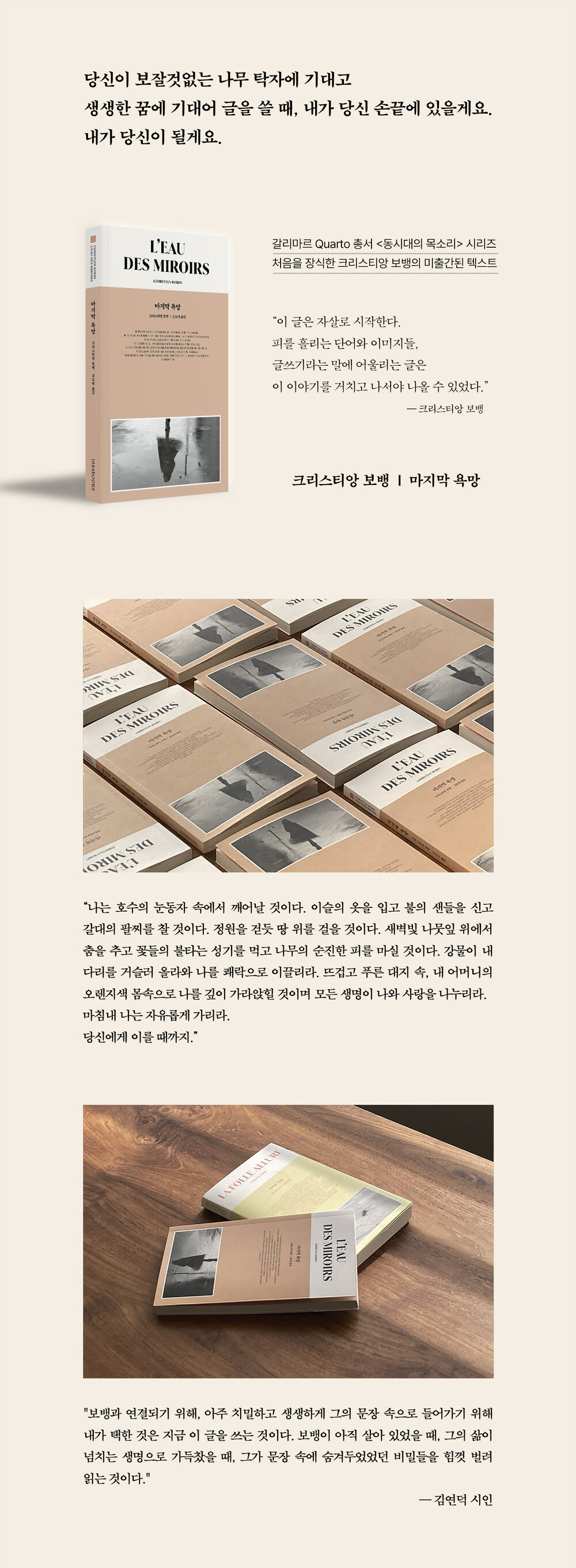 『작은 파티 드레스』 『환희의 인간』 『가벼운 마음』 등 국내에 출간된 소설과 에세이로 독자들의 많은 사랑을 받아온 프랑스 작가 크리스티앙 보뱅의 소설 『마지막 욕망』이 출간되었다. 2022년부터 새롭게 기획된 프랑스 출판사 갈리마르 총서 QUARTO <동시대의 목소리> 시리즈의 처음을 여는 작품이기도 하다.