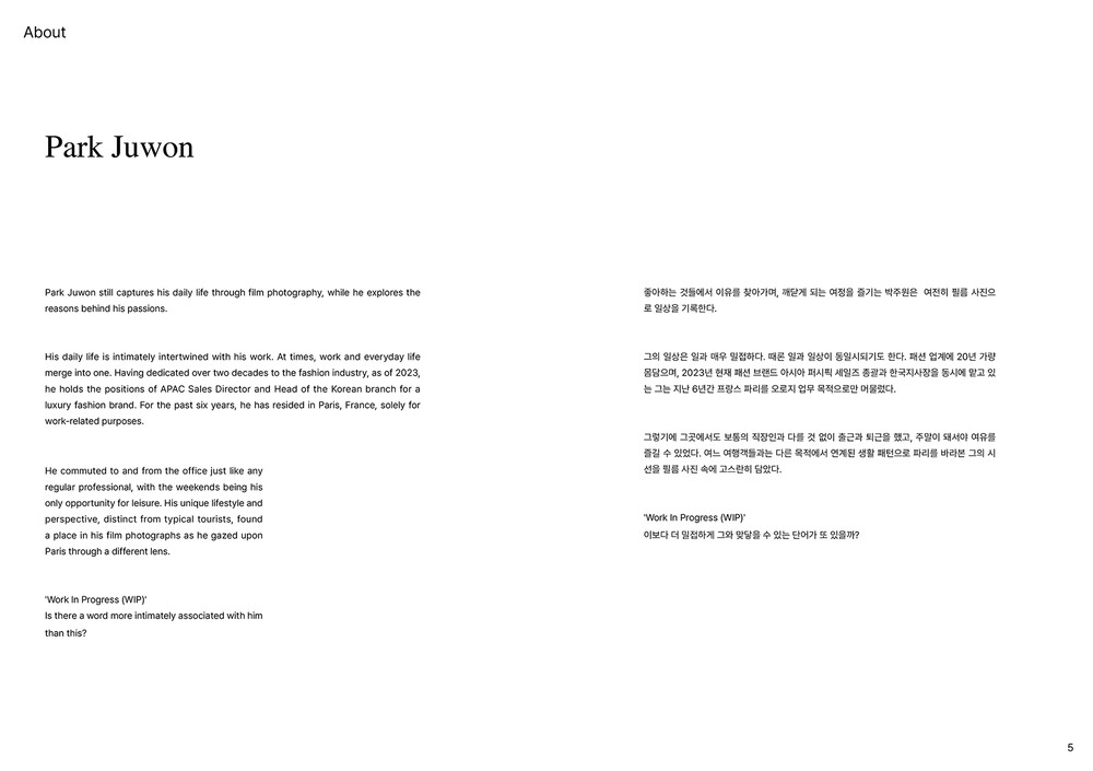 박주원은 패션 업계에 20년 가량 몸담는 동안 여러 도시를 출장의 목적으로 방문했다. 어쩌면 일과 일상이 하나가 된 듯 보이는 그는 'WIP (Work In Progress)'이란 단어가 가장 잘 어울릴지도 모른다.