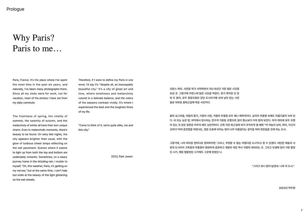 아름다운 파리의 풍경 자체에만 초점을 맞춘 것이 아니라 작가의 일상과 얽혀있는 공간이 주는 의미, 도시의 시각적 아름다움, 문화적 풍요로움과 함께 잘 알려지지 않은 구석구석을 진솔하게 담아낸 사진을 통해 일상의 풍경이 주는 모든 순간 들려줄 이야기와 소중히 간직해야 할 추억이 있다는 것을 일깨워줍니다.