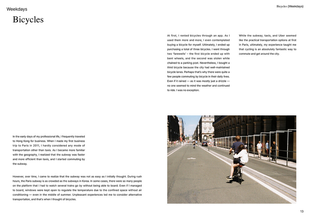 출장으로 머무는 파리 (Paris)에서의 출근과 퇴근, 주중과 주말의 일상 모습을 필름에 담았고, 담백한 에세이도 포함되어 있다.