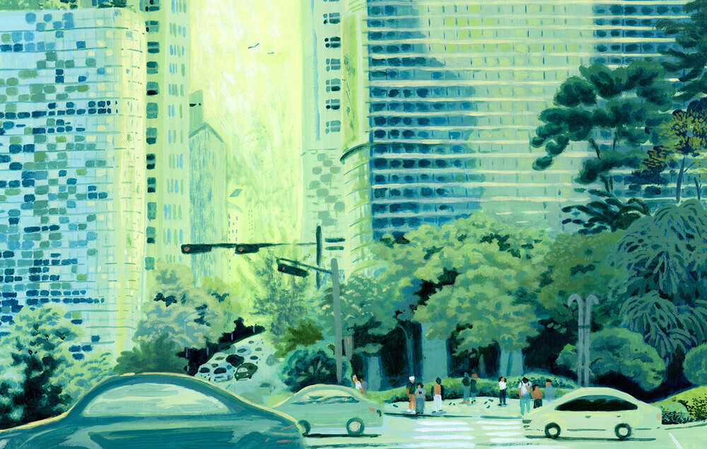 『그건, 고래』가 글로써 고래 된 인간의 새로운 천성을 다룬다면, 이 작품을 관통하는 그림은 전혀 다른 이야기를 한다. 푸르뎅뎅하게까지 보이는 잿빛 도시의 아침에서부터 사위가 어두워지고 새로운 해가 암시되는 근교의 새벽까지를 붓은 부지런히 움직여 내보인다. 하루의 안에서 도시에서 자연으로, 작은 강줄기에서 바다로 나아가는 그림은 『그건, 고래』의 텍스트를, 연결되어 있음을 인식한 ‘인간’을 주제로 삼은 그린이 선택의 결과다. 작은 순간의 아름다움을 흘려보내지 않는 삶, 자신의 근원을 간직하는 삶을 꿈꾼 그린이 소망의 결과다. ‘바다’는 생명의 시작점이자 고래가 사는 곳이므로, 도시에서 바다로 나아간다. 장면장면은 어딘가 있을지도 모르는 공상 속 장소나 한때 있었으나 사라진 추억 속 장소 대신에 지금의 서울을 담는다.