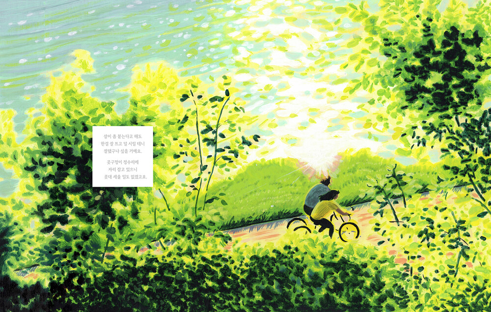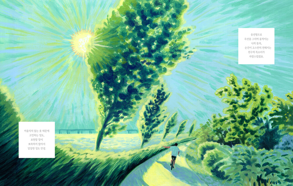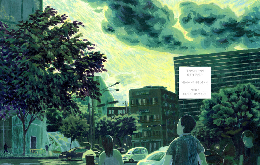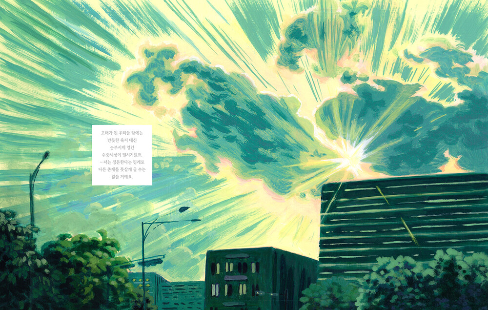 “우리가 고래가 되면 삶은 나아질까?” 어른이 아이에게 물었습니다. “훨씬요.”라고 아이는 대답했습니다. “고래가 된 우리들 앞에는 반듯한 육지 대신 눈부시게 엉킨 수중세상이 펼쳐지겠죠. …더는 정돈한다는 핑계로 다른 존재를 못살게 굴 수는 없을 거예요.”