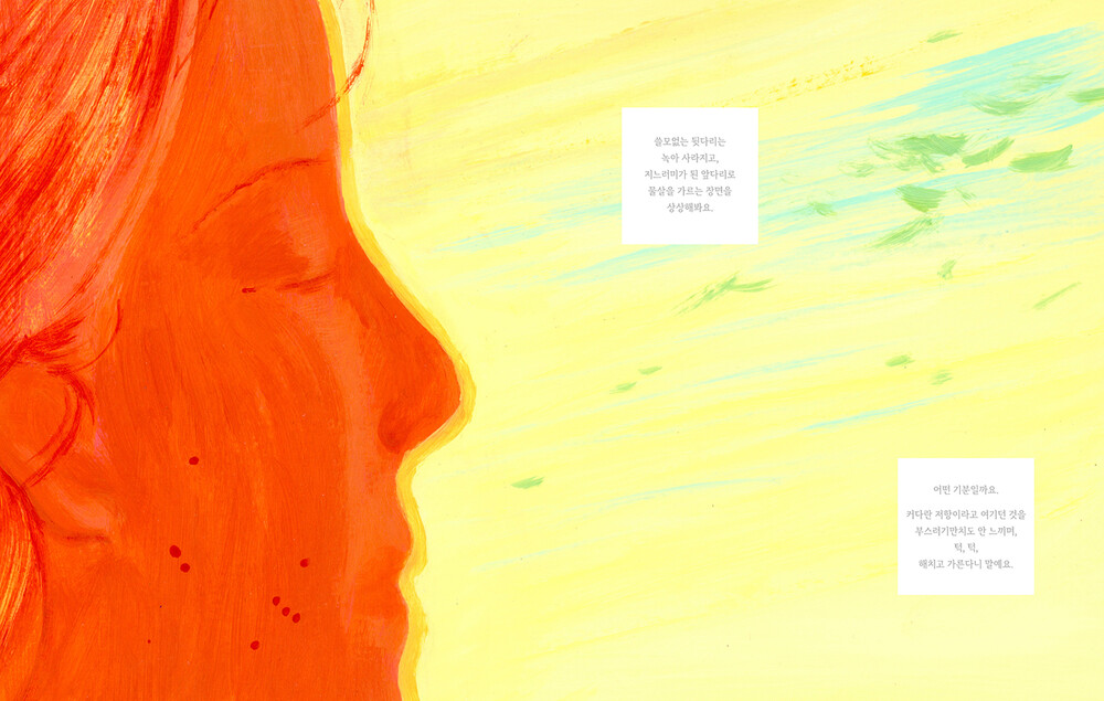쓸모없는 뒷다리는 녹아 사라지고, 지느러미가 된 앞다리로 물살을 가르는 장면을 상상해봐요. 어떤 기분일까요. 커다란 저항이라고 여기던 것을 부스러기만치도 안 느끼며, 턱, 턱, 해치고 가른다니 말예요.