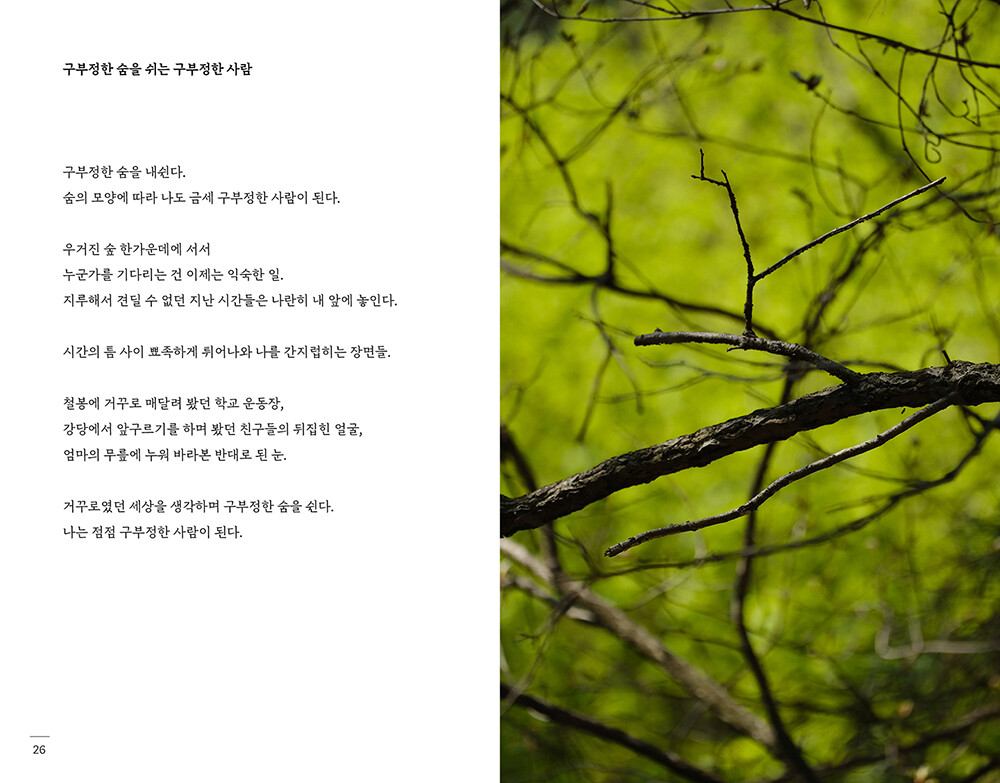 나무들 사이로 새 한 마리가 보인다. 새의 고향은 동그라미다. 동그라미의 끝자락에는 갈 곳을 잃은 단어들이 수북이 포개져 있다. 아직 태어나지 않은 새들. 아직 어둠에서 나오지 못한 말들. 바스락거리는 단어들은 우리와 마주할 적당한 때를 찾는다.