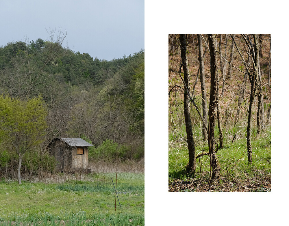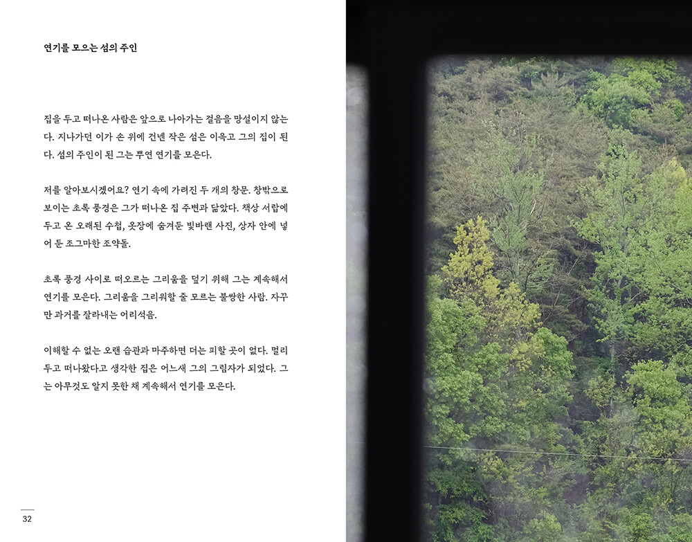 1년 동안 주변의 초록 풍경을 사진으로 담았다. 초록의 이미지를 담으며 계속해서 떠올린 것은 죽음이었다. 반짝이며 빛나는 것들 안에 기쁨이 있다면 그 뒷면에는 언제나 동일한 질량의 슬픔도 있다. 길을 걷다가 만난 초록 풍경도 마찬가지였다. 푸릇함이 주는 생명력을 보면 어쩔 수 없이 죽음이 떠올랐다. 생명이 있는 곳엔 죽음이 있고, 진실이 있는 곳엔 거짓이 있고, 순간이 있는 곳엔 영원이 있다. 서로 반대되는 것들 사이에는 도무지 떼어놓을 수 없는 단단한 연결이 있다. 우리가 보지 못하는 이면에는 또 다른 세계가 펼쳐진다. 서로가 없으면 그 무엇도 존재하지 않는 세계. 《포개진 계절》은 초록의 뒷면에 관한 책이다. 초록 뒤에 켜켜이 쌓인 수많은 계절과 죽음, 사라짐에 관한 이야기. 결국 이 모든 건 조화(harmony)에 관한 이야기이기도 하다.