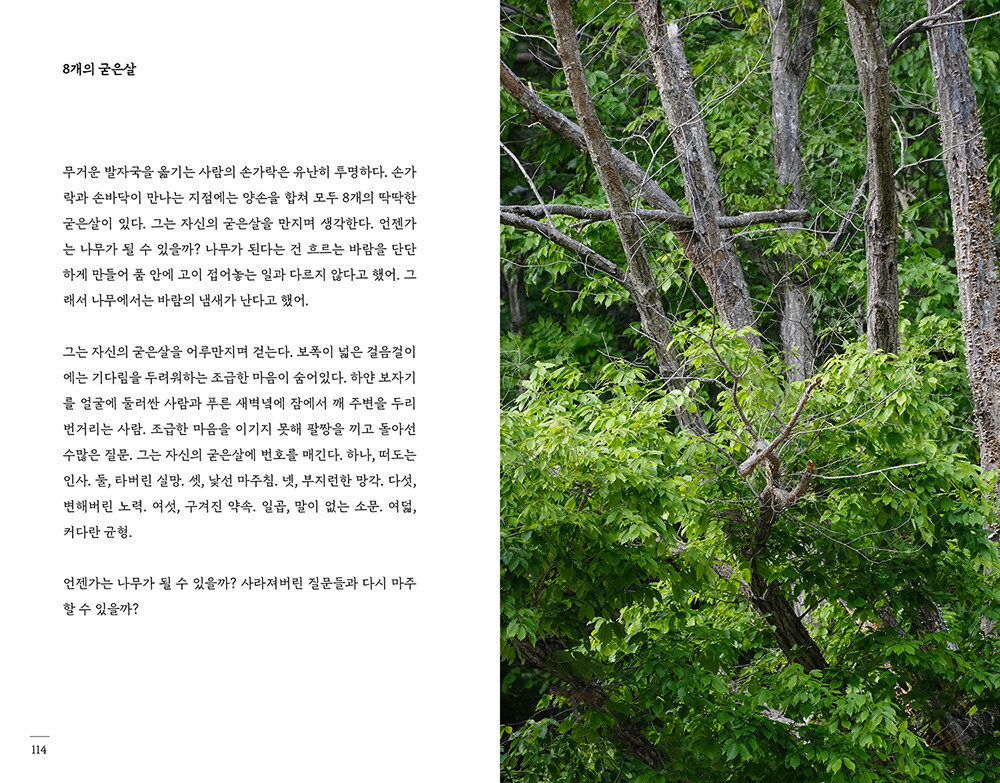 무거운 발자국을 옮기는 사람의 손가락은 유난히 투명하다. 손가락과 손바닥이 만나는 지점에는 양손을 합쳐 모두 8개의 딱딱한 굳은살이 있다. 그는 자신의 굳은살을 만지며 생각한다. 언젠가는 나무가 될 수 있을까? 나무가 된다는 건 흐르는 바람을 단단하게 만들어 품 안에 고이 접어놓는 일과 다르지 않다고 했어. 그래서 나무에서는 바람의 냄새가 난다고 했어.