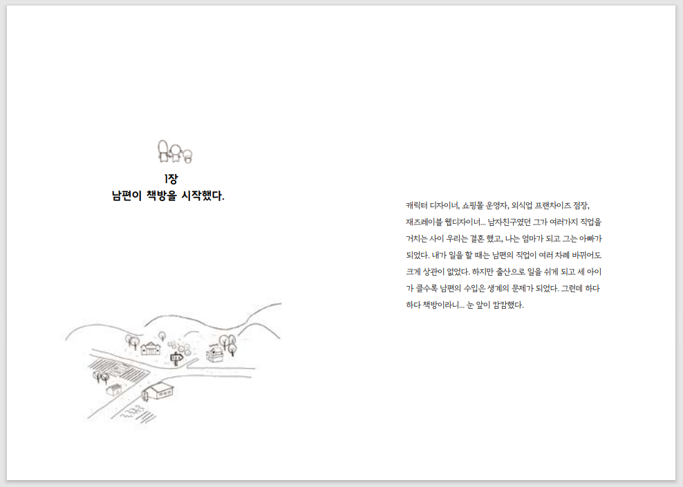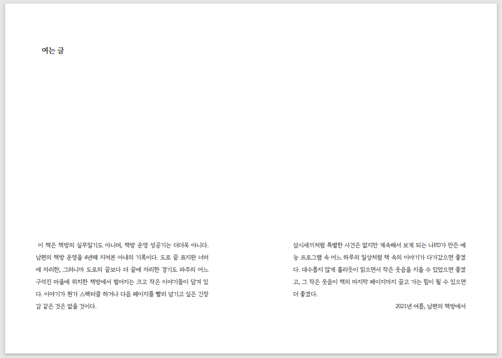 이 책은 책방 실무일기도 아니며 책방 운영 성공기는 더더욱 아닙니다. 남편의 책방 운영을 4년째 지켜 본 아내의 기록입니다.