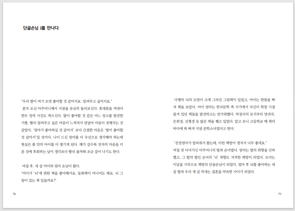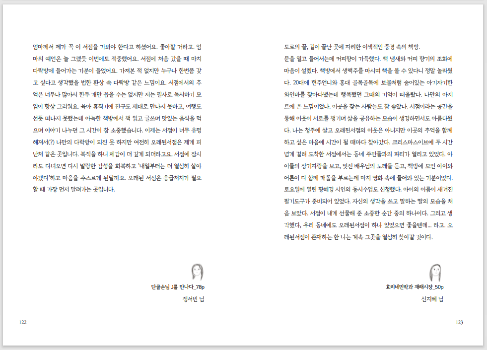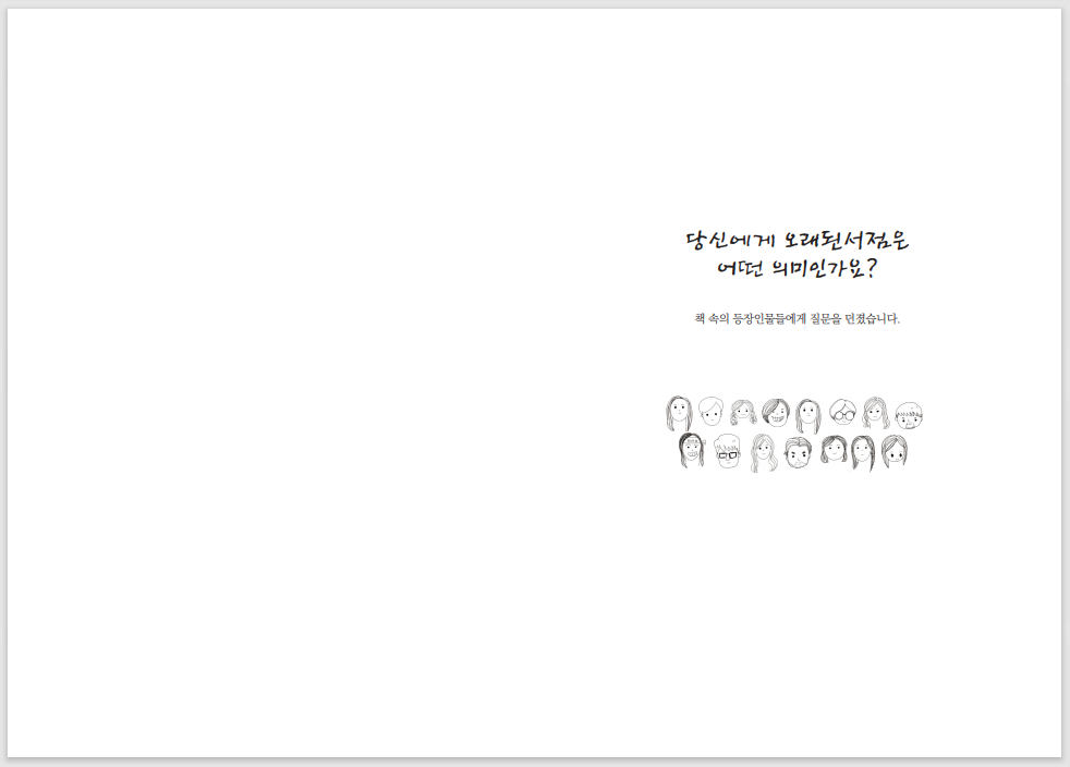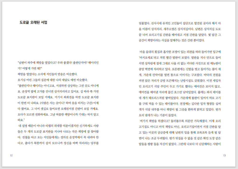 이 책을 읽고서 동네 책방에 한명이라도 더 애정을 품게 되었으면 좋겠습니다.