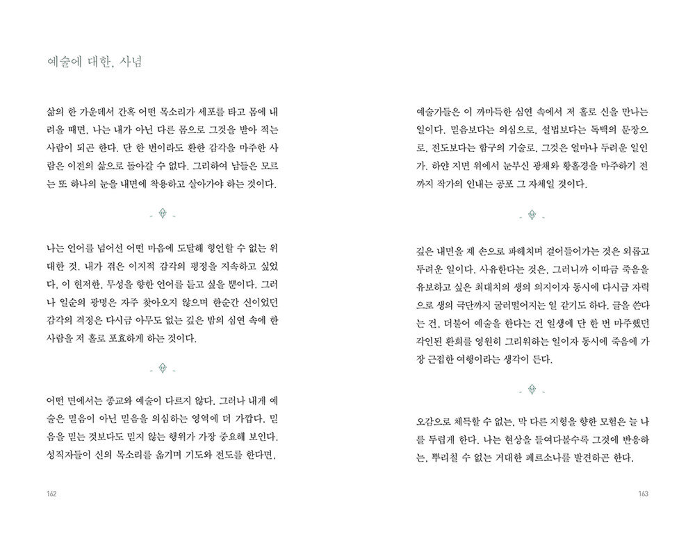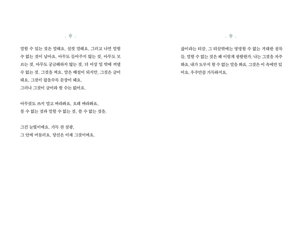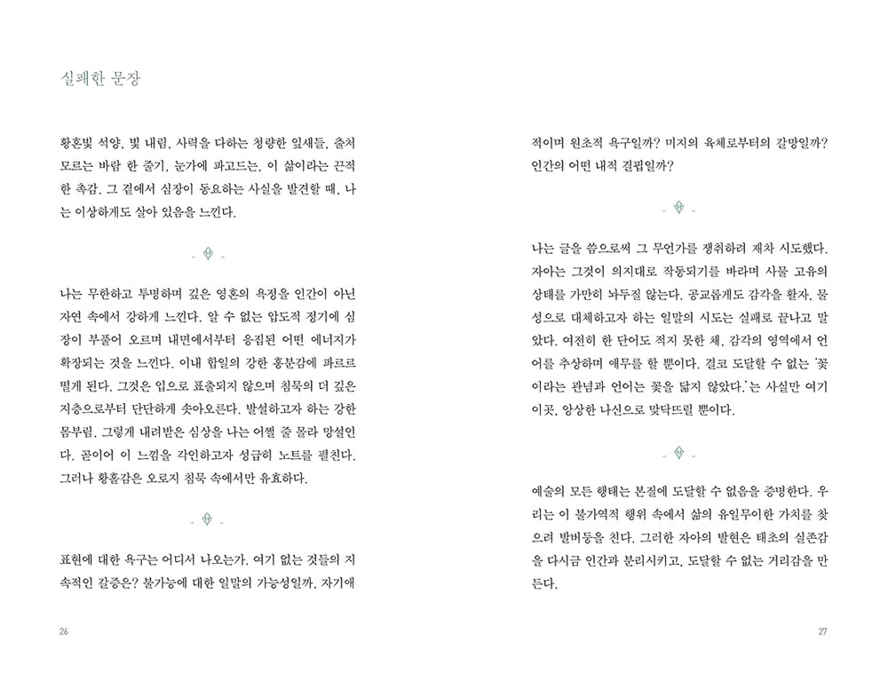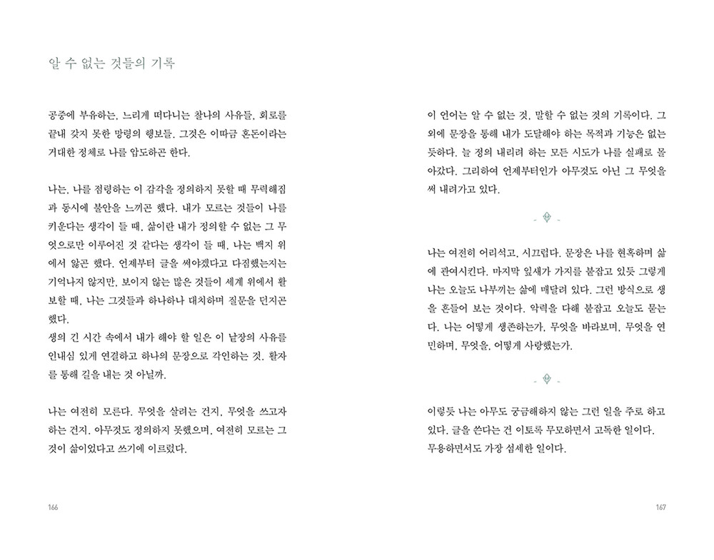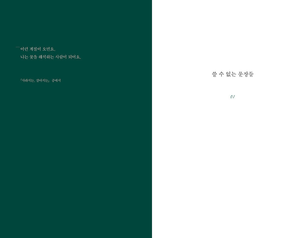 <kunst fuer das Leben : 삶을 위한 예술> 이라는 부제의 <쓸 수 없는 문장들> 은 작가노트에 가까운 단상집이며 “쓸 수 없는 문장들”, “침묵의 화 법”, “밤의 몽상”, “나는 세상 모든 것들의 사이”, 그리고 “영혼에 대하여” 다시금 인간으로서 바라본 장면들 “모든 것이 유서였다” 마지막으로 "작업노트"로 구성되어 있습니다.