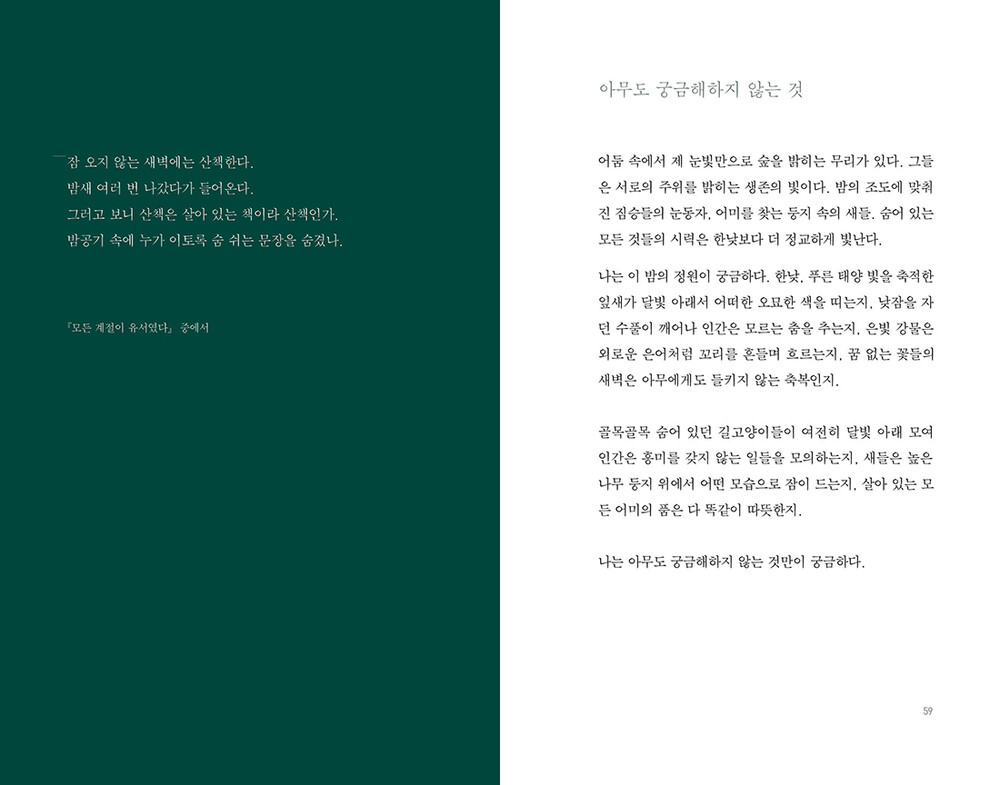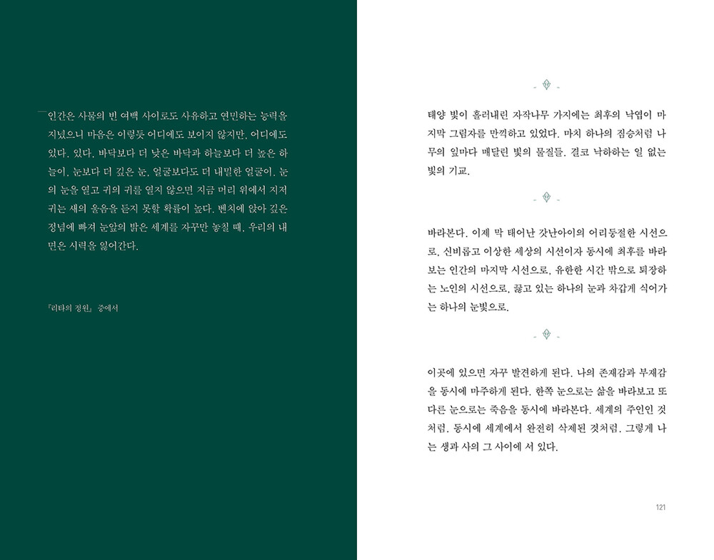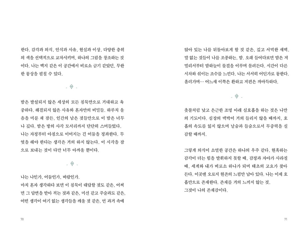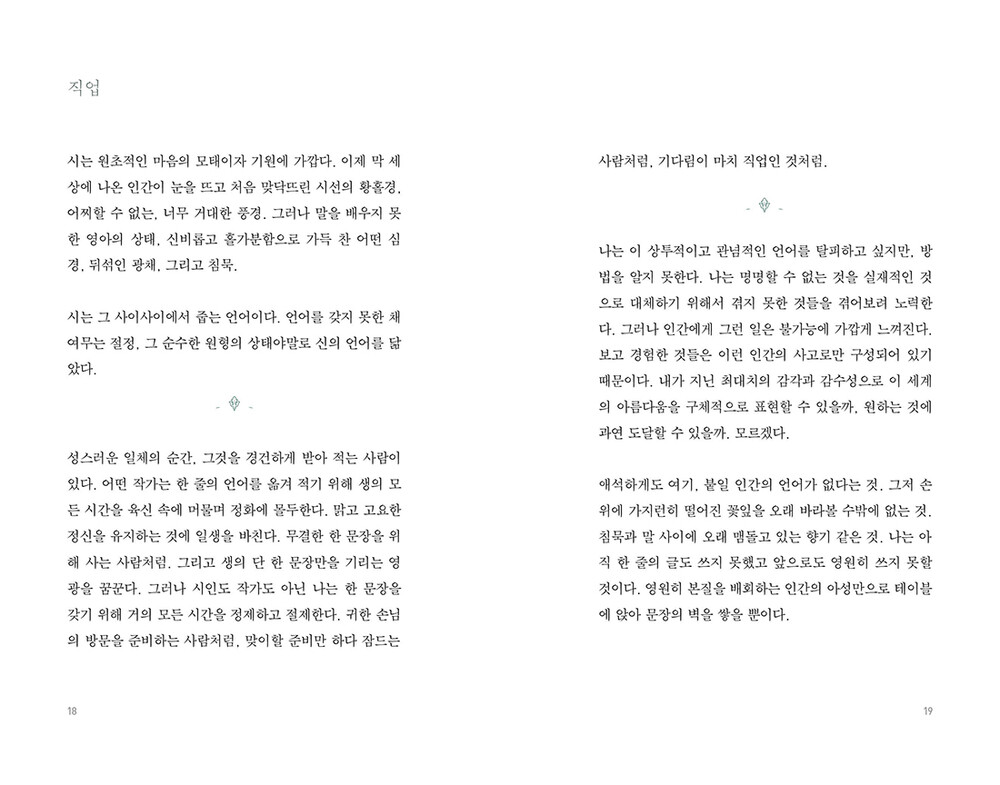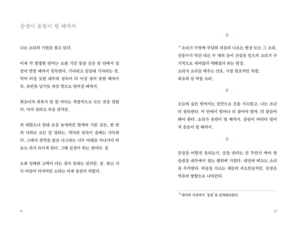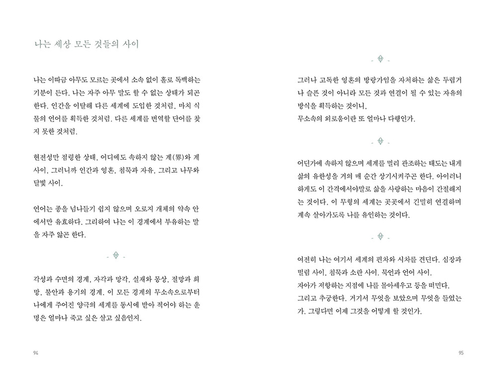 <kunst fuer das Leben : 삶을 위한 예술> 이라는 부제의 <쓸 수 없는 문장들> 은 작가노트에 가까운 단상집이며 “쓸 수 없는 문장들”, “침묵의 화 법”, “밤의 몽상”, “나는 세상 모든 것들의 사이”, 그리고 “영혼에 대하여” 다시금 인간으로서 바라본 장면들 “모든 것이 유서였다” 마지막으로 "작업노트"로 구성되어 있습니다.