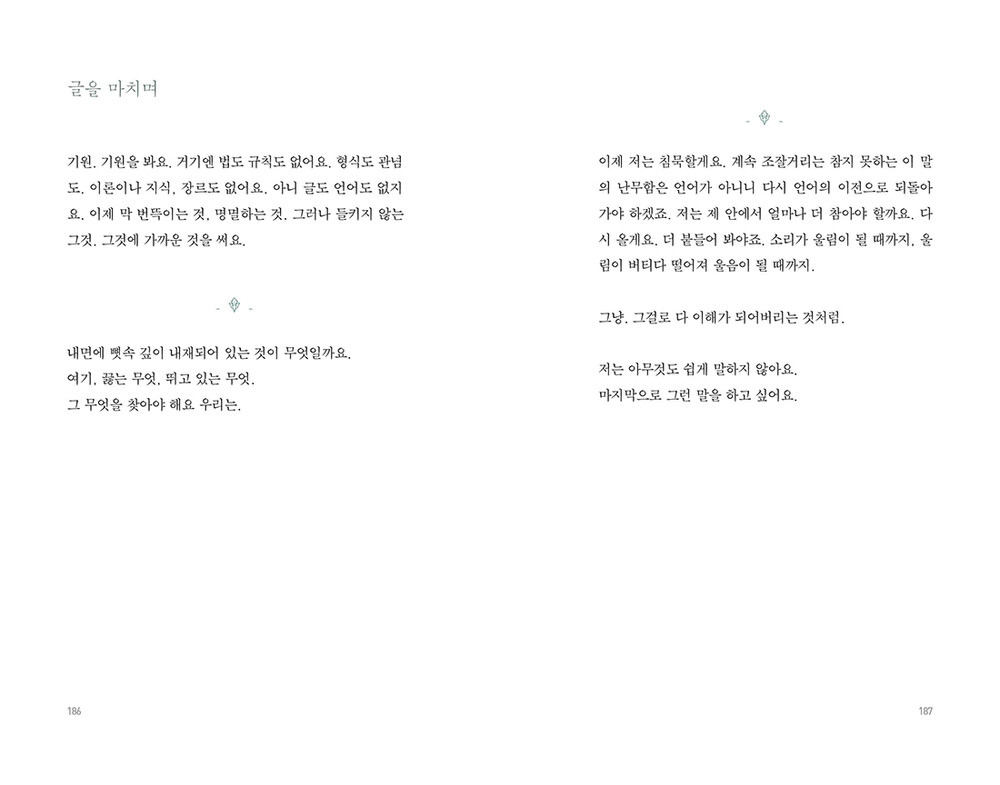 「쓸 수 없는 문장들」은 문장과 삶 사이에서 그리고 세계와 나 사이를 오가며 마주한 본류적인 고민, 개인의 철학과 사유를 담아냈습니다. 글을 쓰는 사람 이라면 자신의 내면 깊은 우물을 길러, 사유의 지층을 파내는 일련의 과정을 겪으며 작업을 하게 되지요. 이 책은 작업 노트에 가까운 글입니다. 코로나와 더불어 긴 침묵의 시간 동안 무엇을 쓸 것인가. 많은 생각을 했었습니다. 그 리고 줄곧 따라다니는 글 쓰는 일에 대해, 또 그 책임의 무게와 함께, 작가의 태도에 대해 고민을 했었습니다.