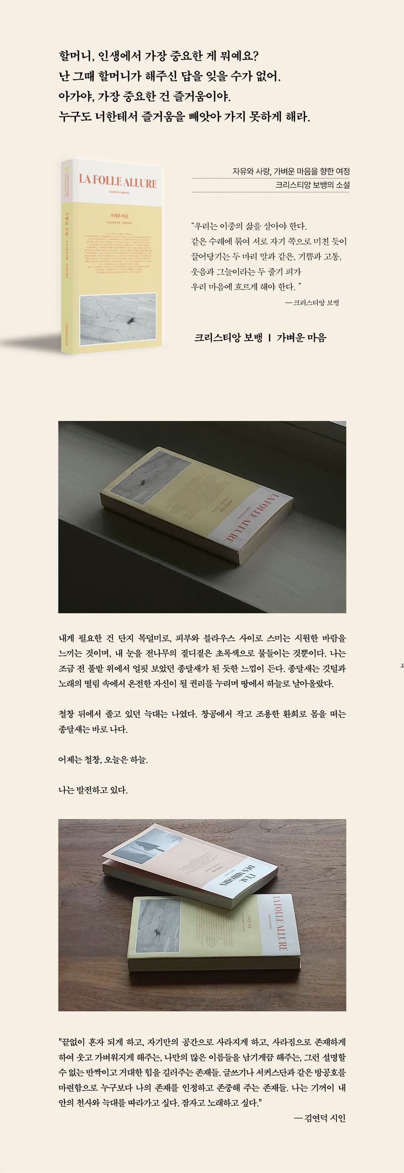 짙은 어두움 속에서도 삶의 환희를 찬양하는 시인이 쓰는 소설은 어떤 모습일까. <가벼운 마음>은 보뱅의 시적인 문장과 단어들이 가벼이 날아올라 춤추며 흐려진 영혼에 빛을 비추고, 우리 안에 오래 묻혀 잊혀졌던 것들을 깨워 다시 한번 삶의 환희로 우리를 초대하는 작품이다. <작은 파티 드레스> <환희의 인간> <그리움의 정원에서>와 같은 산문에서 보여주었던 일상의 삶 속에서 발견하는 보석같은 순간들과 죽음마저도 넘어서는 사랑에 대한 찬가도 아름다웠지만, 소설이라는 장르를 통해 이야기되는 그의 사유 역시 실로 자유롭고 우아하며, 이야기꾼으로서의 새로운 면모 역시 여실히 보여준다.