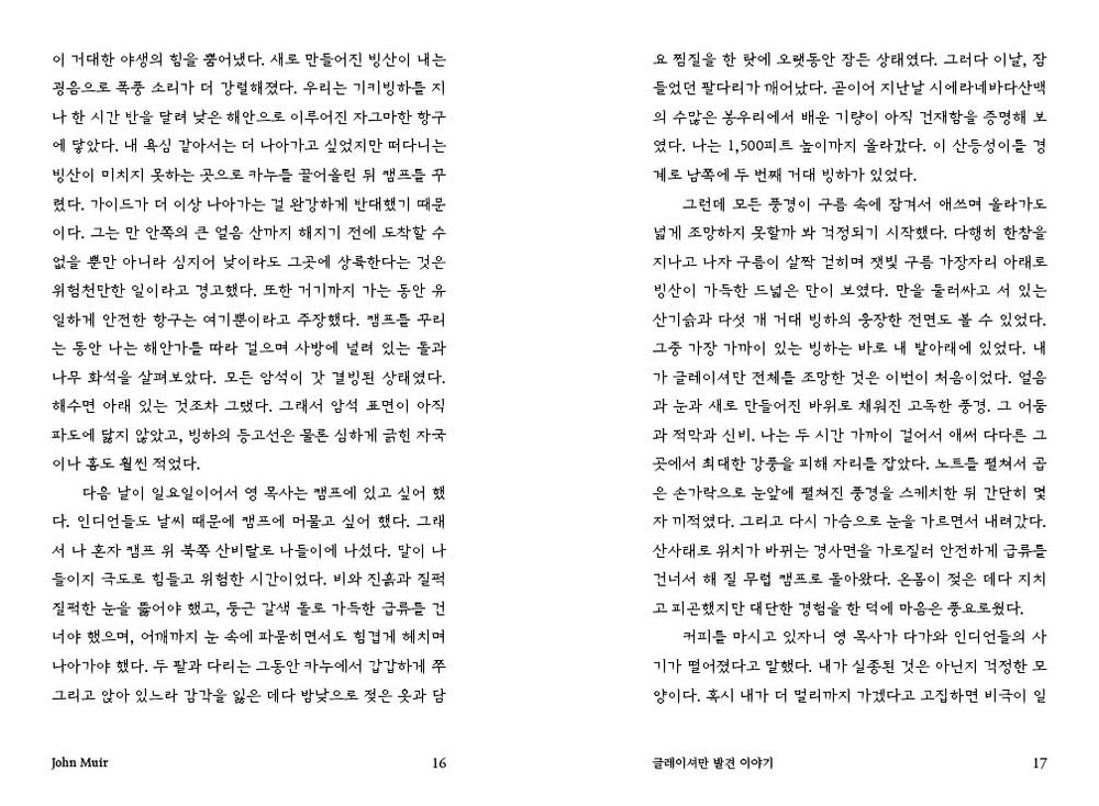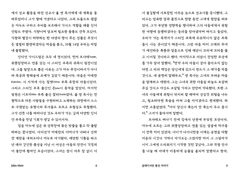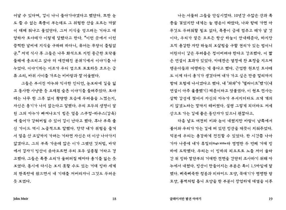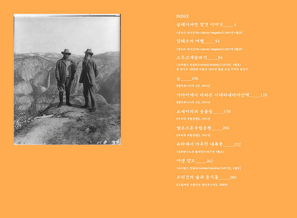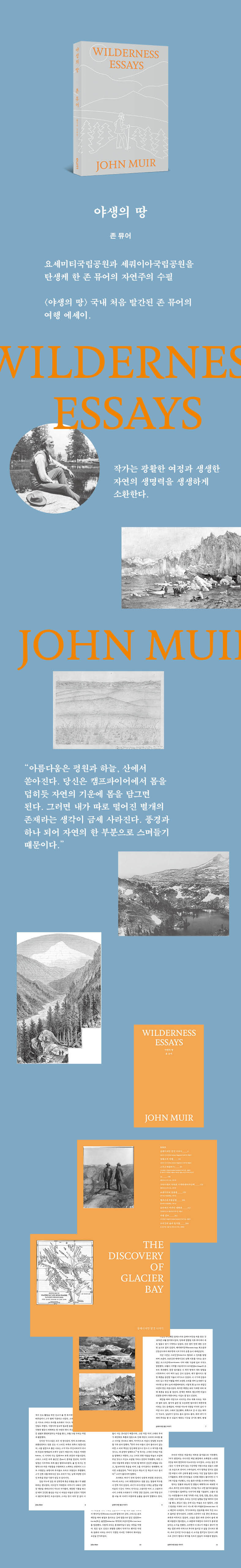 요세메티의 인자한 거인, 존 뮤어의 수필집이 국내에서 처음으로 출간되었다. 존 뮤어는 스코틀랜계 미국인, 환경보호가이자 수필가, 세계적인 규모의 환경단체인 시에라 클럽의 창립자이자 초대 회장이다. 1889년 존 뮤어는 [센츄리 매거진]의 편집장인 로버트 존슨을 초청하여 요세미티를 국립공원으로 지정해야 하는 이유와 방법을 이야기했고 결국 1890년 요세미티가 국립공원으로 지정되었다. 그는 숲과 국립공원의 보존에 일생을 헌신하였으며 자연의 아름다움을 지지하는 많은 이들의 열렬한 옹호를 받고 있다.
