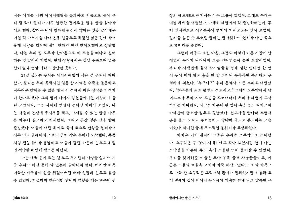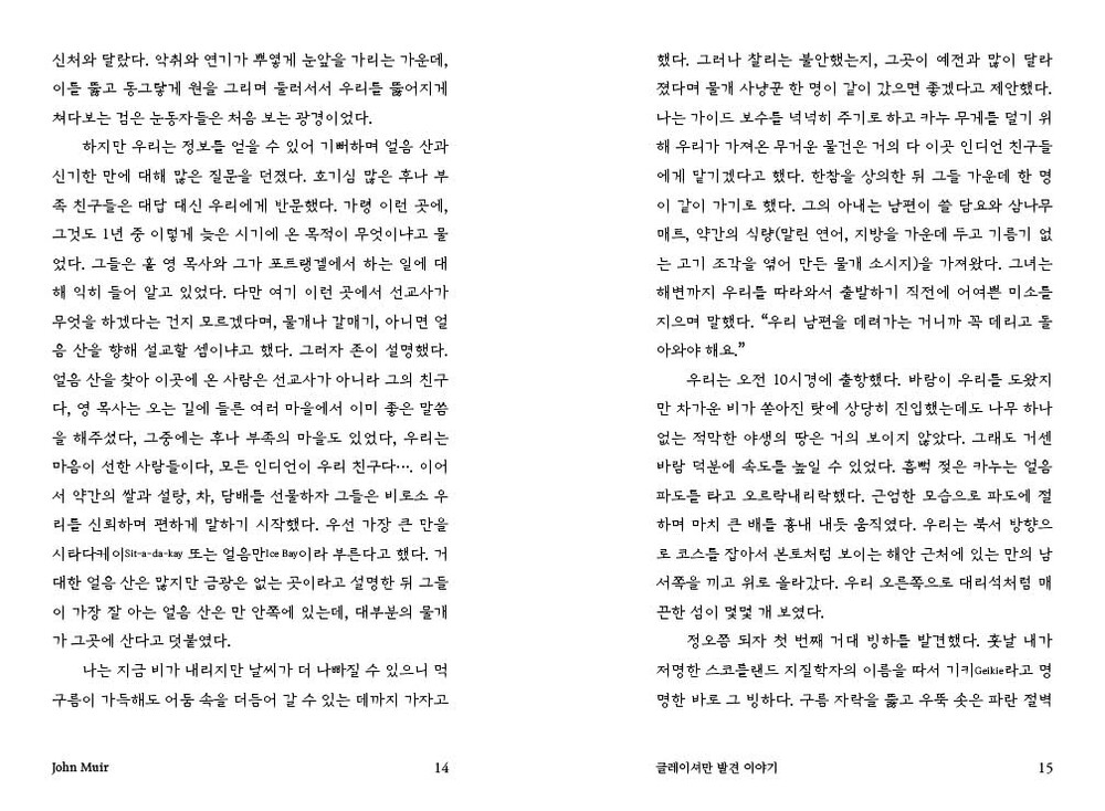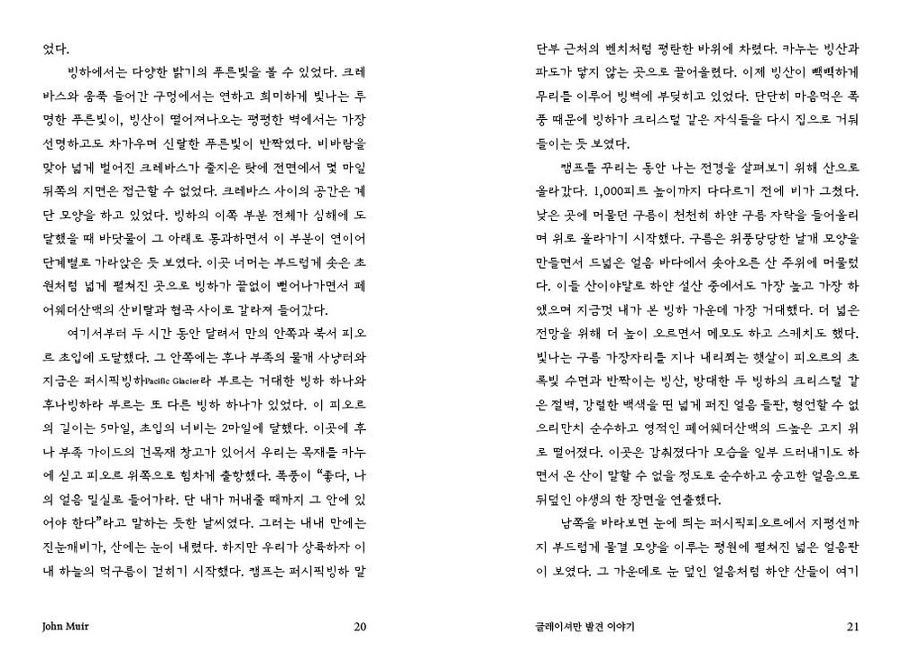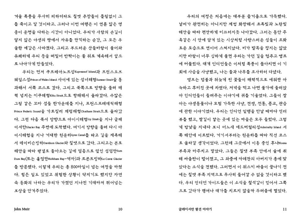 존 뮤어는 ‘내 삶의 유일한 목적은 사람들이 대자연의 사랑스러운 모습에 시선을 돌리게 하는 것’이라고 밝혔다. 그는 풍경 묘사뿐만 아니라 자연 경관과 인간의 관계를 담아내려 애썼다. 그의 글에는 광활하고 기나긴 여정과 위험, 인간의 힘을 초월한 자연의 생명력이 생생하게 소환된다. 그의 에세이 ‘알래스카 여행’에서 뮤어는 알래스카의 아름다움을 극찬하고 관광객들의 방문을 권유했다. 독자들은 그의 발자취를 따라 그가 그토록 설득력 있게 묘사했던 지역들을 찾고 싶어진다. 뮤어 글은 자연의 아름다움을 칭송하는 데에서 더 나아가 삶의 지혜와 나아갈 길을 안내하는 지침서로 오늘날에도 많은 여행자의 사랑을 받고 있다.