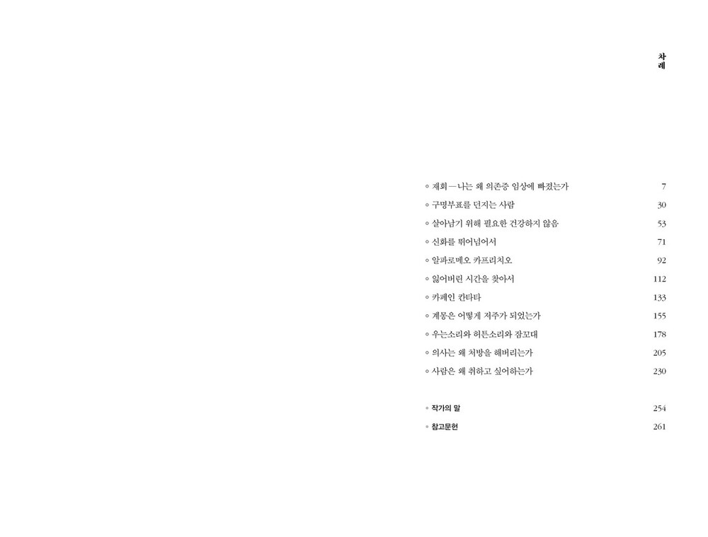 저자는 살아남기 위해 스스로를 병적인 상태로 몰아가는 이러한 현상이 소수의 아픈 사람에게 만 일어나는 일은 아니라고 말한다. 저자 자신도 대학 시절 학업에 열중하기 위해 카페인 약물에 의존했고 지난한 의존증 치료의 무력감을 견디기 위해 병적으로 게임에 몰두했다고 고백한다. 많은 사람들이 쓸모없는 취미에 집착하고 지나치게 매운 음식을 먹는 것 역시 힘든 일상을 버티기 위해 ‘건강하지 않은’ 일을 하며 균형을 맞추는 행위라고 저자는 말한다.