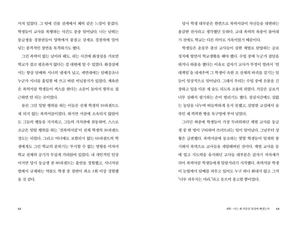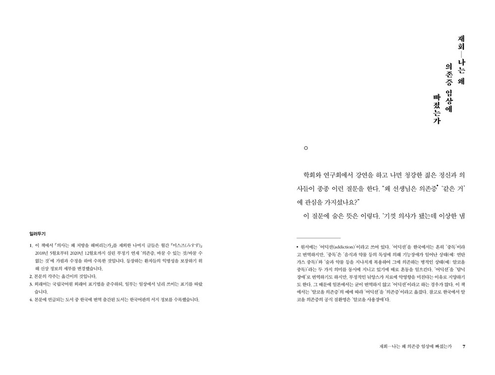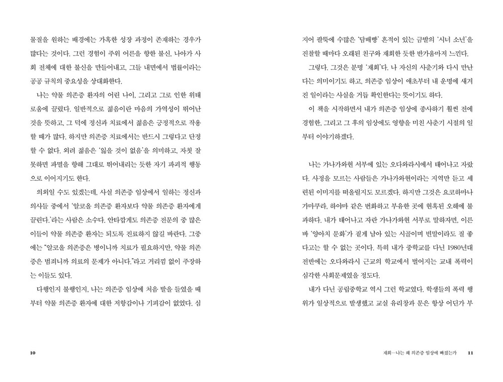 책을 시작하며 저자는 폭력서클이 지배한 중학교에 다니던 시절 자신의 의존증 임상이 운명적으로 시작되었다고 회고한다. 학생과 교사의 폭력이 충돌하던 학교에서 저자는 학생회 임원으로서 시너와 담배에 빠진 폭력서클 학생들을 회유하는 역할을 했던 것. 각별한 사이였지만 끝내 시너를 끊지 못했던 친구는 저자의 의사 생활 내내 환영처럼 따라다니고, 저자는 젊은 의존증 환자와 ‘불량 청소년’들에게 각별한 애정을 갖게 된다.