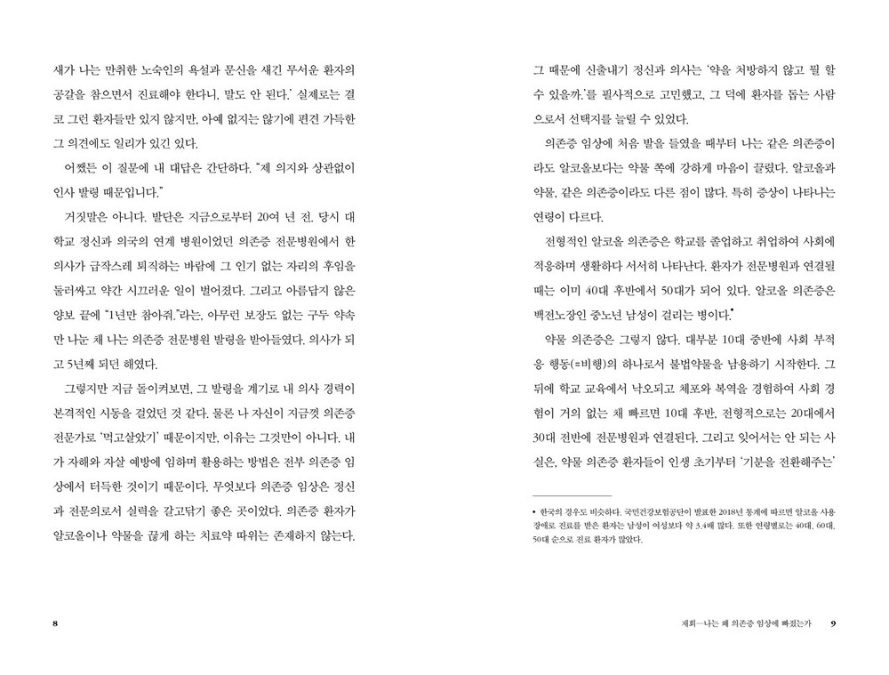 “사람은 배신하지만, 약은 배신하지 않아.” 나는 의존증 임상 현장에서 그런 말을 여러 환자에게 들었다. 그들은 안심하고 타인에게 의존할 수 없는 사람, 혹은 마음속에 덩그러니 뚫린 구멍을 ‘타인과 연결’되어 메우지 못하고 약이라는 ‘물건’으로 메우려 하는 사람들이다. 그렇지만 비뚤어지고 도전적인 표현으로라도 사람에 대한 절망을 사람에게 전하는 그 모순된 행위 자체가 ‘타인과 연결’되기를 원하는 마음을 드러내는 것 아닐까? _본문 28면 중에서