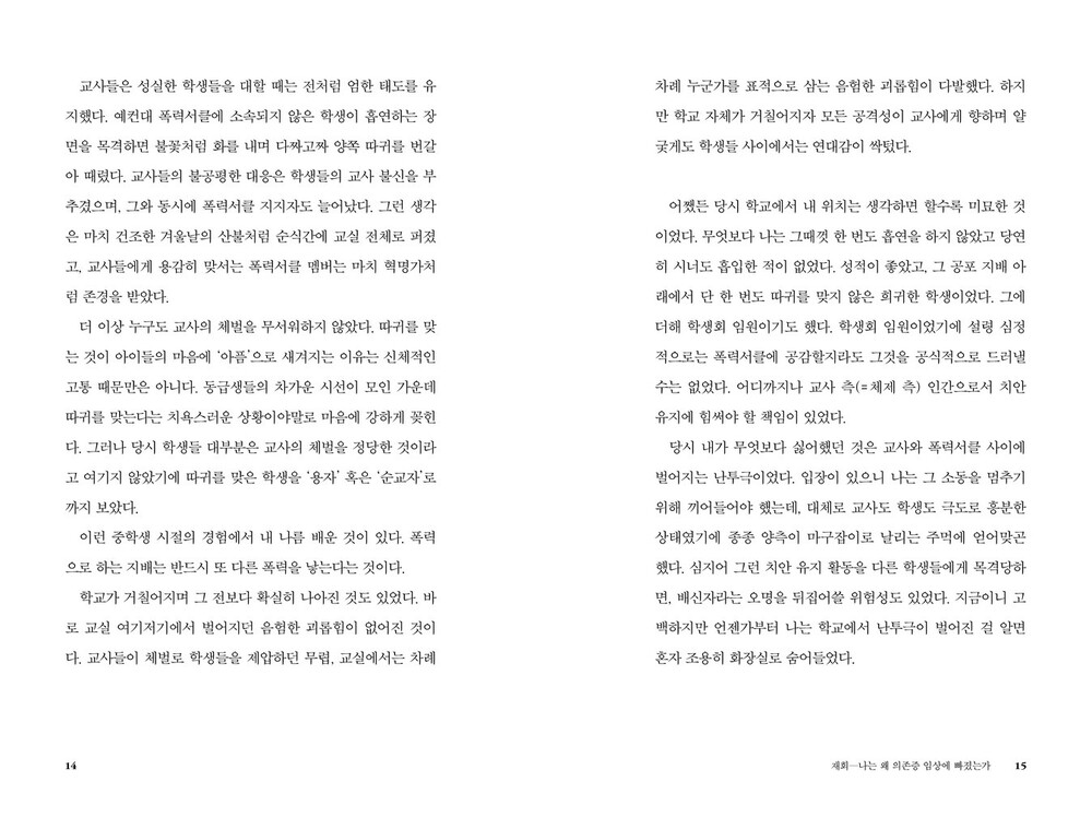 아마도 자해 행위는 ‘아픔으로 아픔을 억제하는’ 행위일 것이다. 트라우마라는 스스로 설명도 제어도 할 수 없는 고통에서 정말 한순간이나마 벗어나기 위해 자해 행위라는 스스로 설명도 제어도 할 수 있는 고통을 이용하는 것이다. 그것은 적어도 일시적으로는 자살을 피하는 데 도움이 된다. 과식과 구토로 인한 신체적 고통도 마찬가지다. 그래서 과식・구토 및 자해 행위는 상습적이고 습관적이다. 왜냐하면 ‘고통의 완화’가 일종의 보상으로 기능하기 때문이다. _본문 68면 중에서
