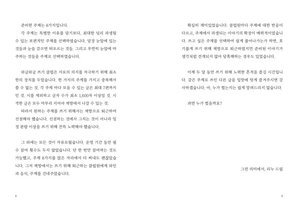 따라서 원하는 주제를 쓰기 위해서는 책방으로 퇴근하여 선점해야 했습니다. 선점하는 것에 그치는 것이 아니라 일정 분량 이상을 쓰기 위해 잔뜩 노력해야 했습니다.